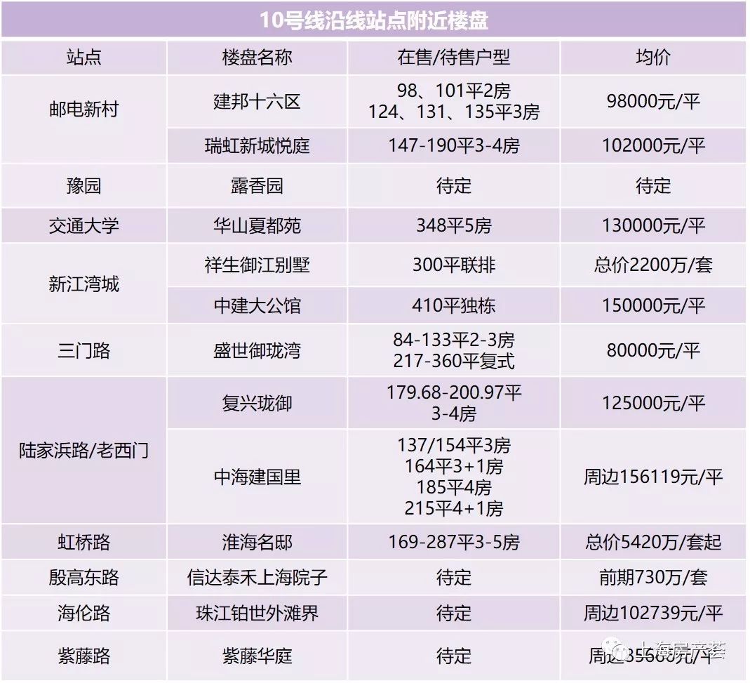 地铁10号线途经新天地、豫园、南京路、淮海路、四川路、五角场等上海中心区域,因而被称为“白金线路”。从杨浦新江湾城到虹口四川北路,从黄浦老西门到闵行龙柏,其涉及的楼盘多为高端改善型项目。