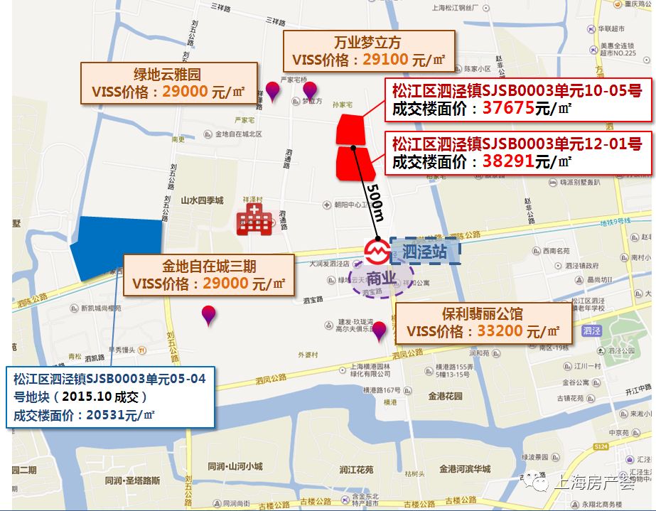 泗泾板块内目前在售楼盘是金地自在城玺湾(自在城四期项目);2016年5月,泗泾两宅地开拍,最终被格力、融创竞得,成交楼面价分别为37675元/平和38291元/平,成交楼面价大幅超过在售楼盘价格。(当时金地自在城三期均价29000元/平)。