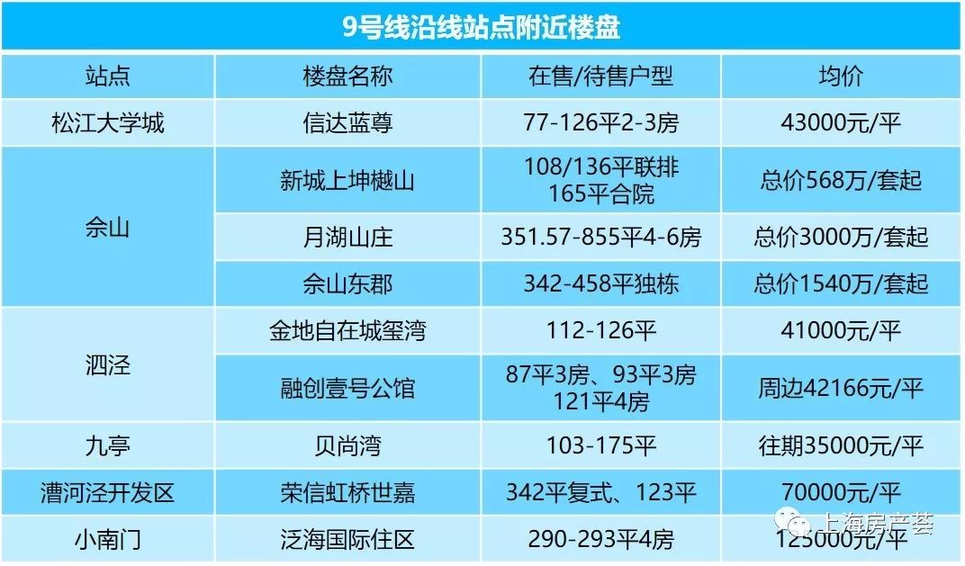 作为一条连接主城区和郊区的地铁线路,9号线沿线的供应量已经不多了。除了市中心在售的荣信虹桥世嘉、泛海国际住区,佘山的别墅区外,其余楼盘均价在40000元上下。