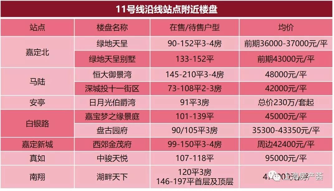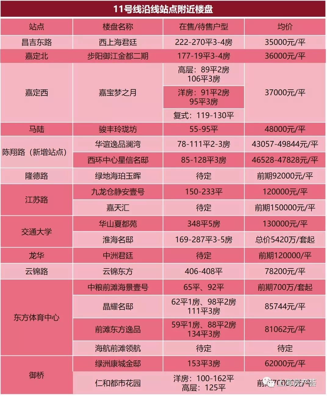 地铁11号线是世界上单线里程最长的一条线路,亦是国内排名前列条跨省地铁线路,途经浦东新区、徐汇区、长宁区、普陀区、嘉定区和江苏昆山。(表格中不包含昆山在售楼盘)