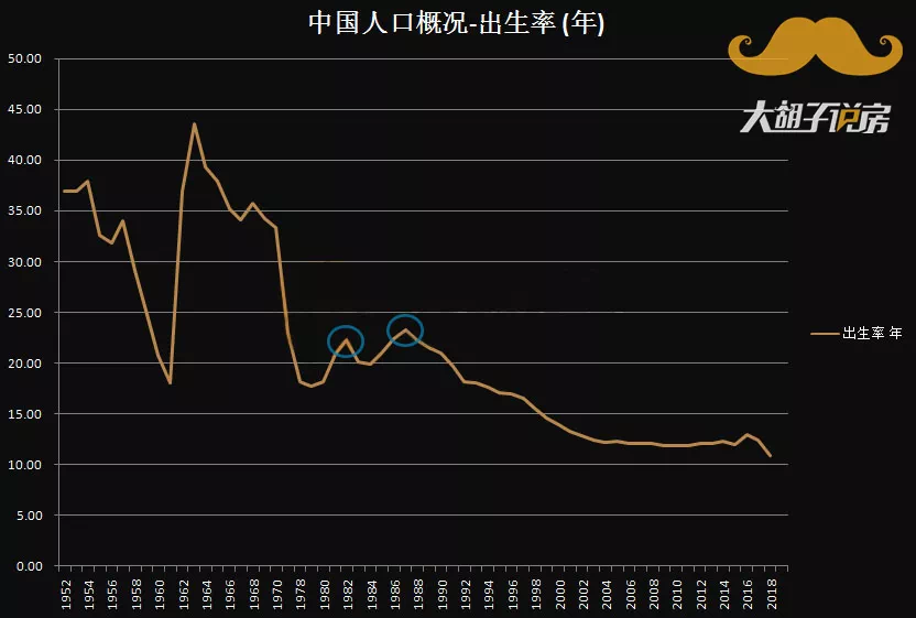 不难发现,中国在1982年和1987年的时候有两个生育高峰期,这两年诞生了大量人口。