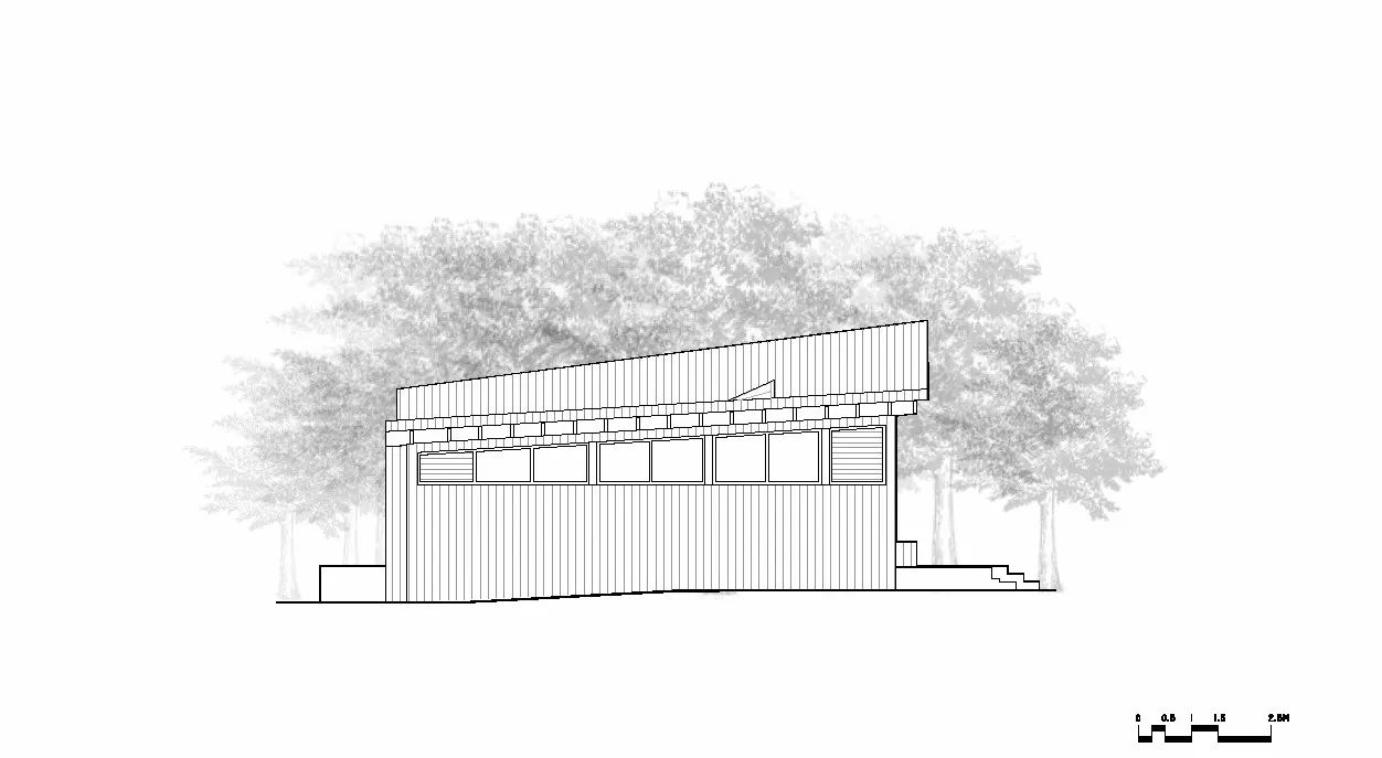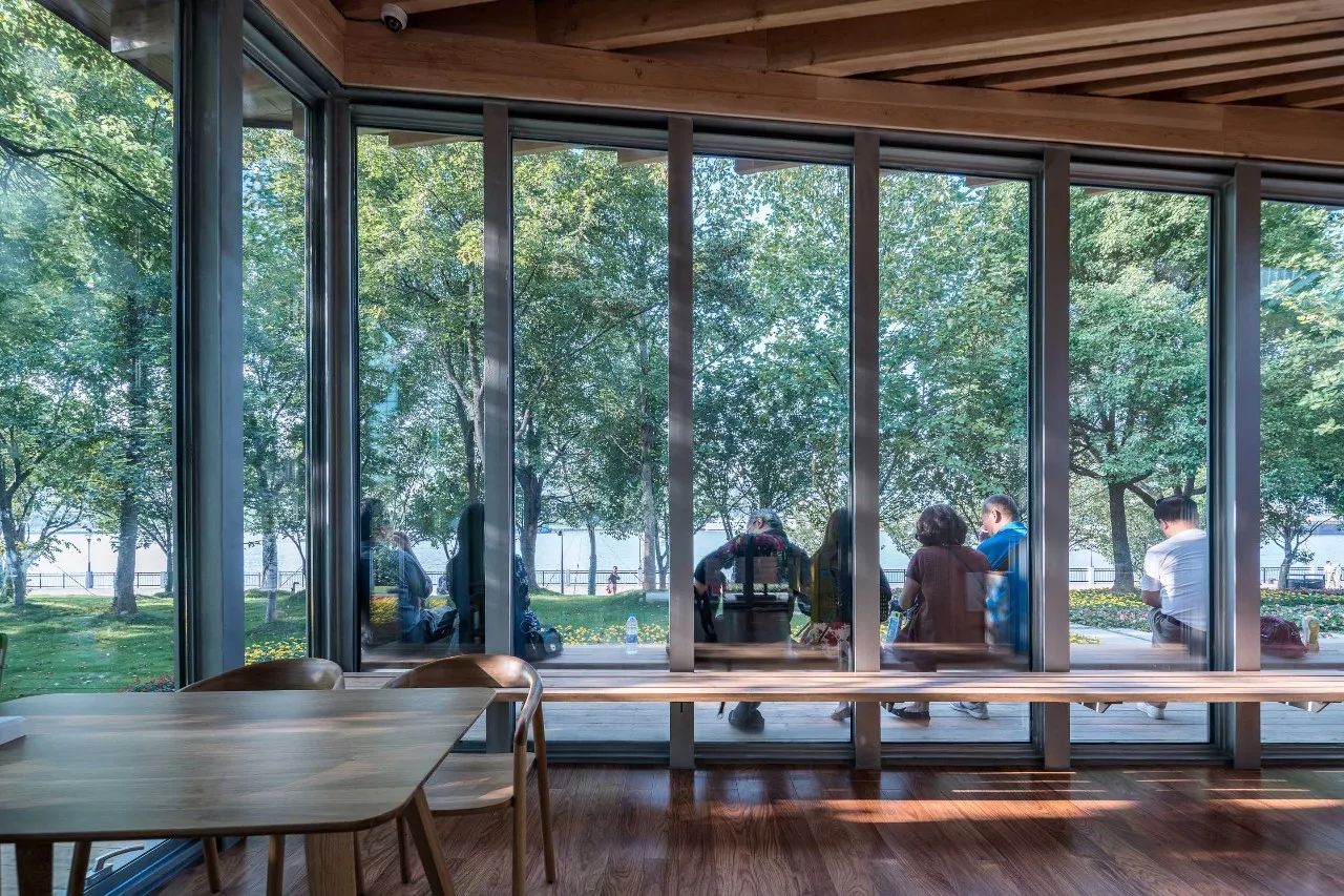 人们由骑行道穿过狭小低矮的通廊拾级而上,屋顶在配合身体的运动渐次升高,原来通廊尽端外的密集树冠在视野中缓缓上升,冲破北侧高敞的屋檐;站在望江平台上豁然开朗,视线向下,透过底部的树干,江面在粼粼波光中水平向展开,与江边或散步或奔跑的人影共同构成流动的风景。