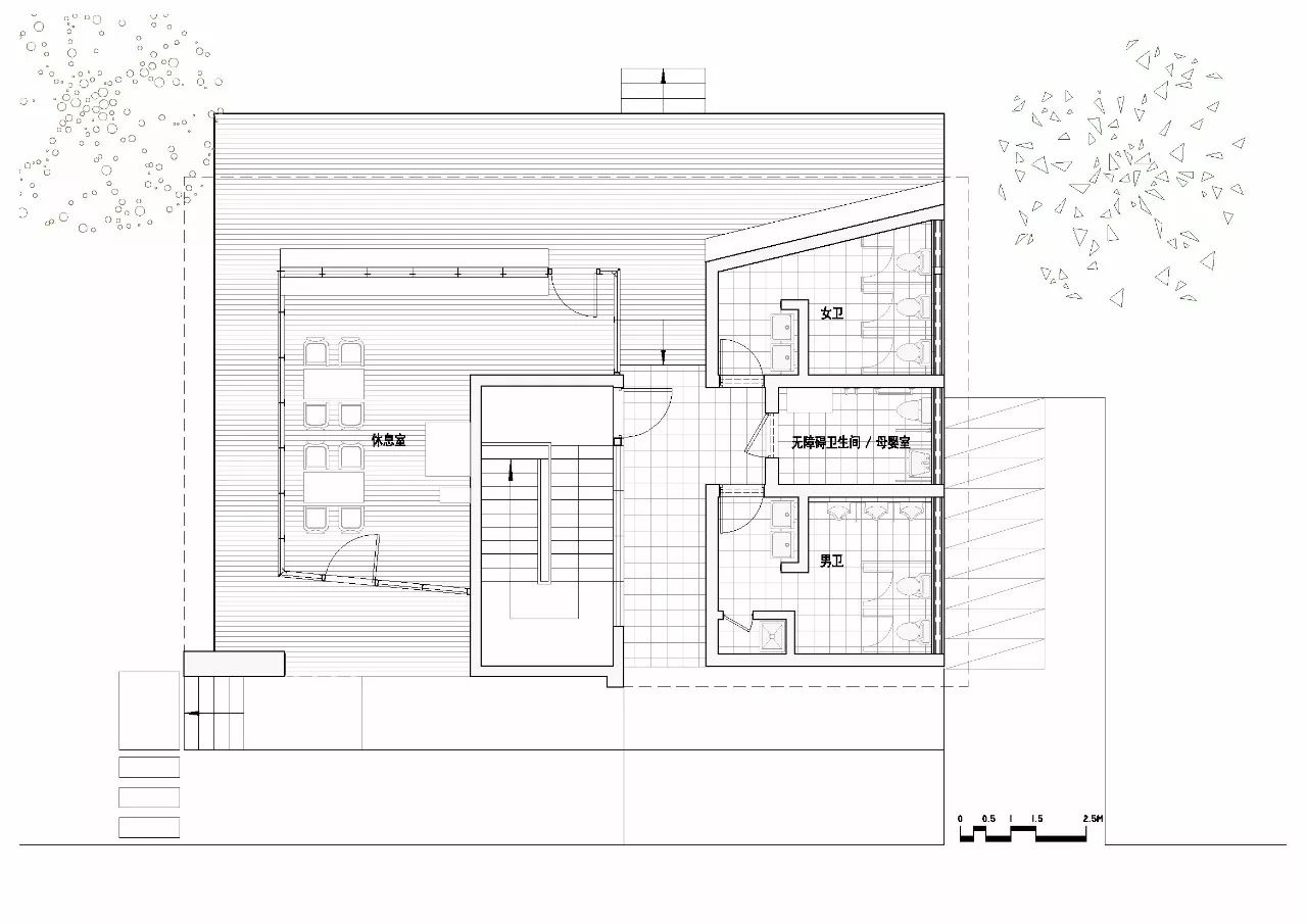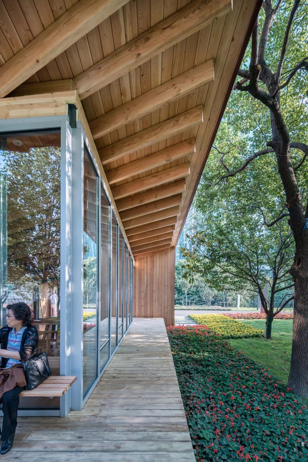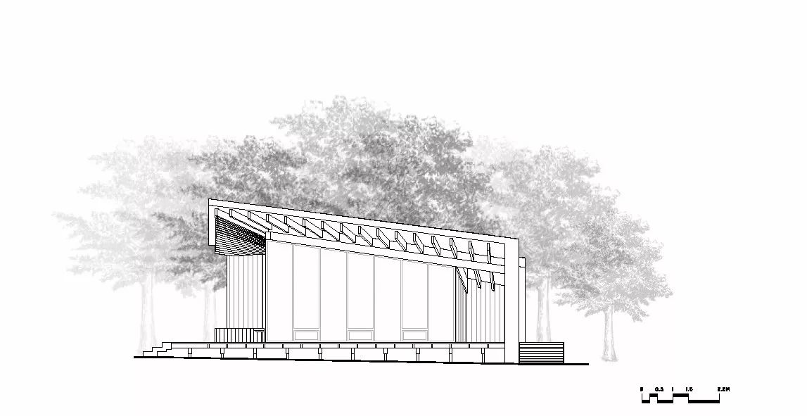整个北侧的反坡屋檐下呈伞状的放射形布置的木檩条成为视觉焦点;檩条汇聚处自然形成一个三角形的天窗,一半在休息室内,一半在通廊上,将幽暗的屋顶深处照亮,强化了空间的进深感。