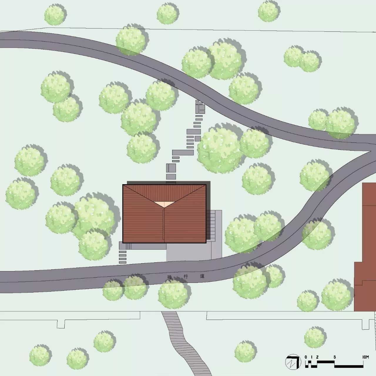 从南侧骑行道看,驿站的屋顶被分为高低不同、但都向内倾斜的东西两半,特别在正中的西段楼梯间角部的屋顶被压到接近视平线的较低点,而且屋顶仿铜板延续到了西段的南侧立面上;这种特意压低的尺度和屋顶与立面的连续性加强了背江面的进入感,将人由居中的通廊引向江景。