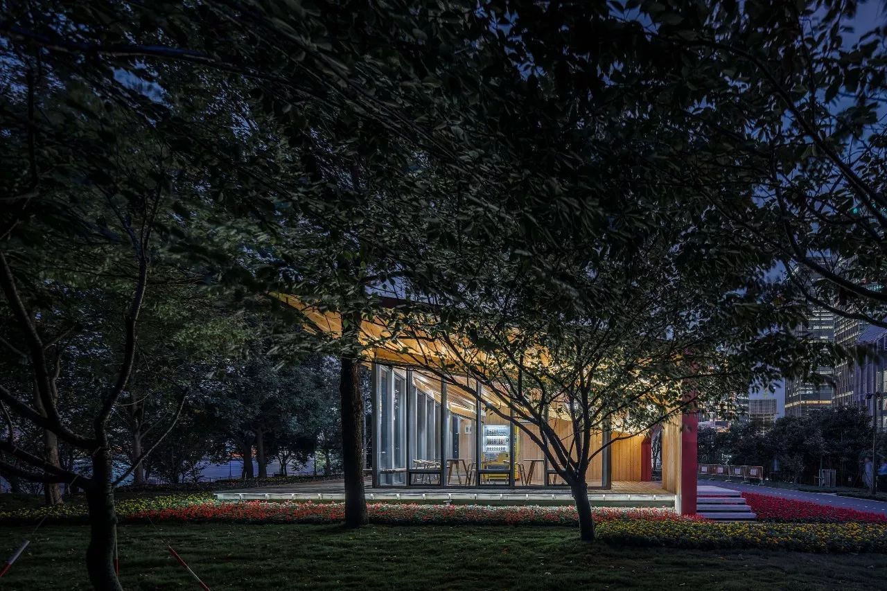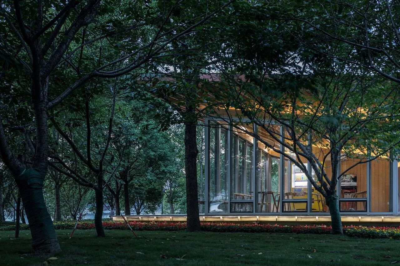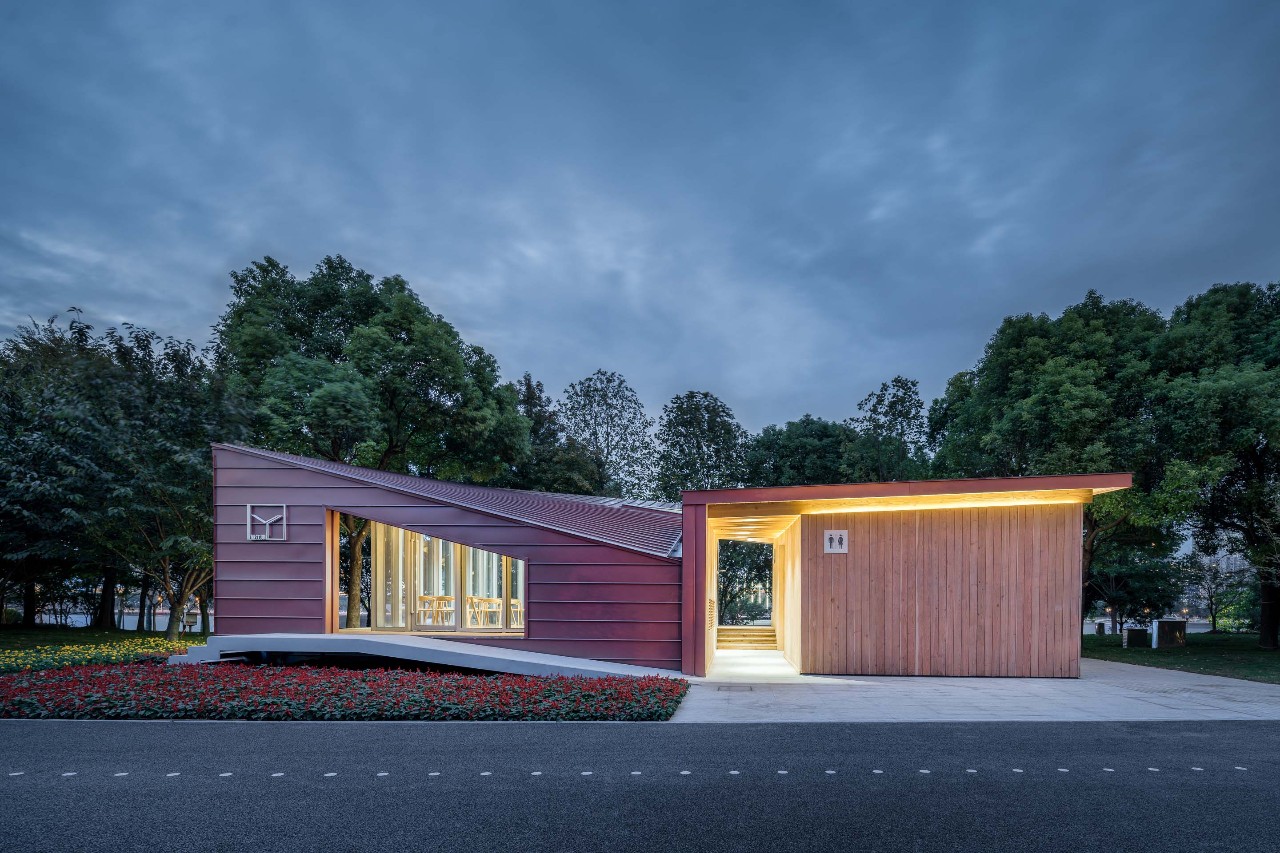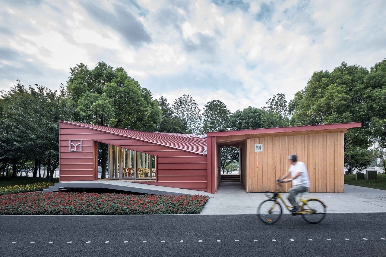 驿站分为东西两个部分:东侧是相对封闭的公共卫生间;西侧是和车库楼梯间结合在一起的L形休息室,面向外滩的北、西两侧都是落地玻璃和休息平台,北侧的望江平台靠着驿站外墙设有长凳供市民小坐。这两部分之间是一条穿越建筑贯通南北的有顶通廊,连接南侧较低处的骑行道和北侧较高处的望江平台。驿站方正的平面轮廓和相对复杂的半螺旋直纹曲面单向檩条木结构仿铜铝镁锰板屋面形成了鲜明的对比。从临江侧看,驿站像是一个微微架空在场地上的出檐深远、屋顶轻盈起翘的大凉亭。