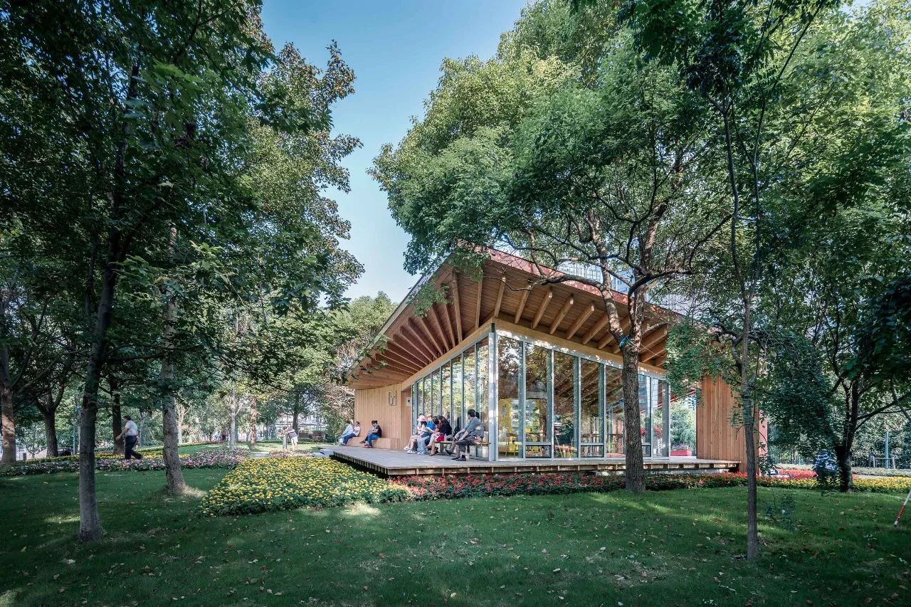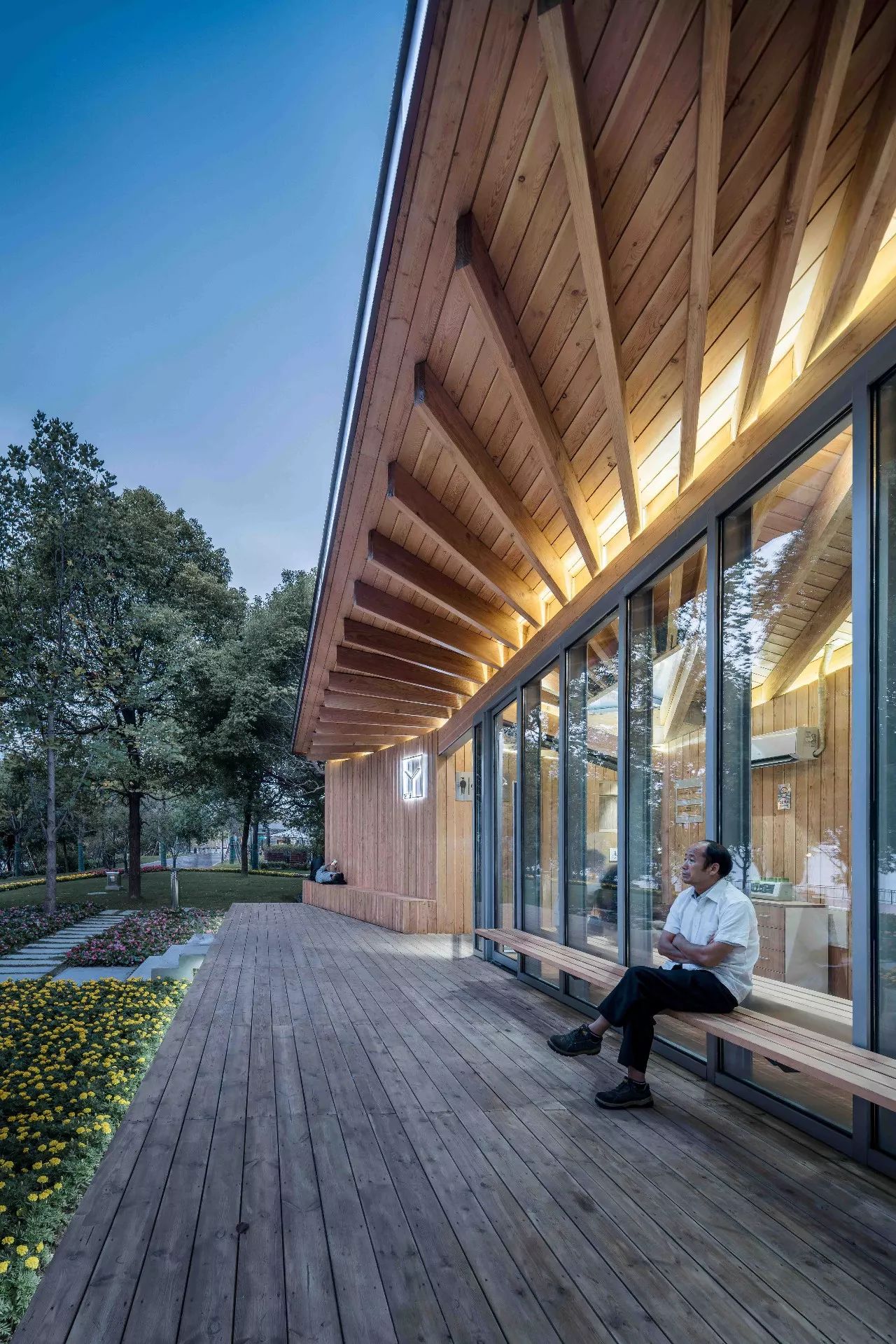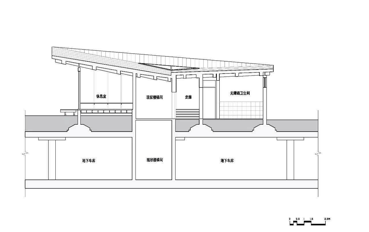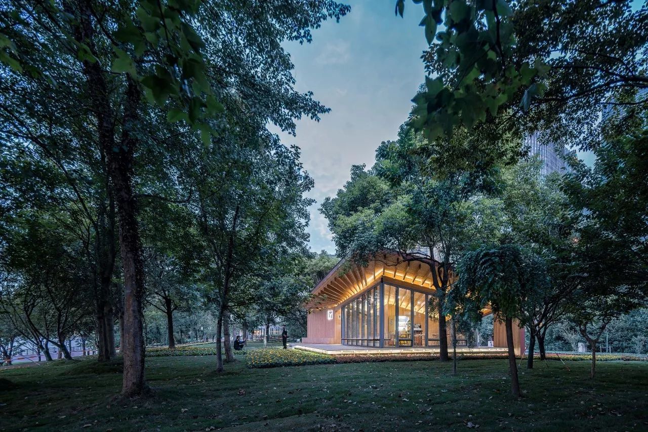 驿站分为东西两个部分:东侧是相对封闭的公共卫生间;西侧是和车库楼梯间结合在一起的L形休息室,面向外滩的北、西两侧都是落地玻璃和休息平台,北侧的望江平台靠着驿站外墙设有长凳供市民小坐。这两部分之间是一条穿越建筑贯通南北的有顶通廊,连接南侧较低处的骑行道和北侧较高处的望江平台。驿站方正的平面轮廓和相对复杂的半螺旋直纹曲面单向檩条木结构仿铜铝镁锰板屋面形成了鲜明的对比。从临江侧看,驿站像是一个微微架空在场地上的出檐深远、屋顶轻盈起翘的大凉亭。