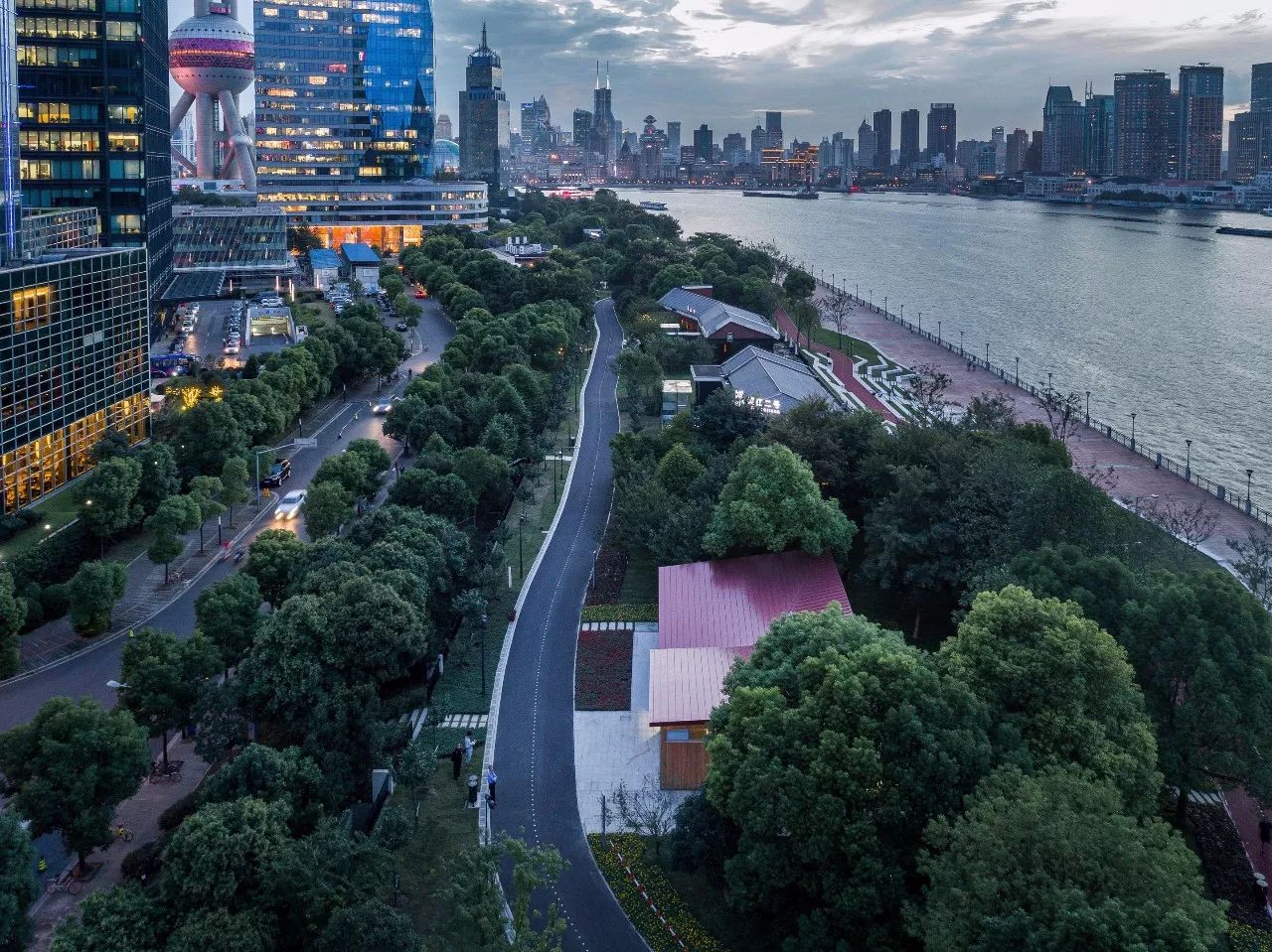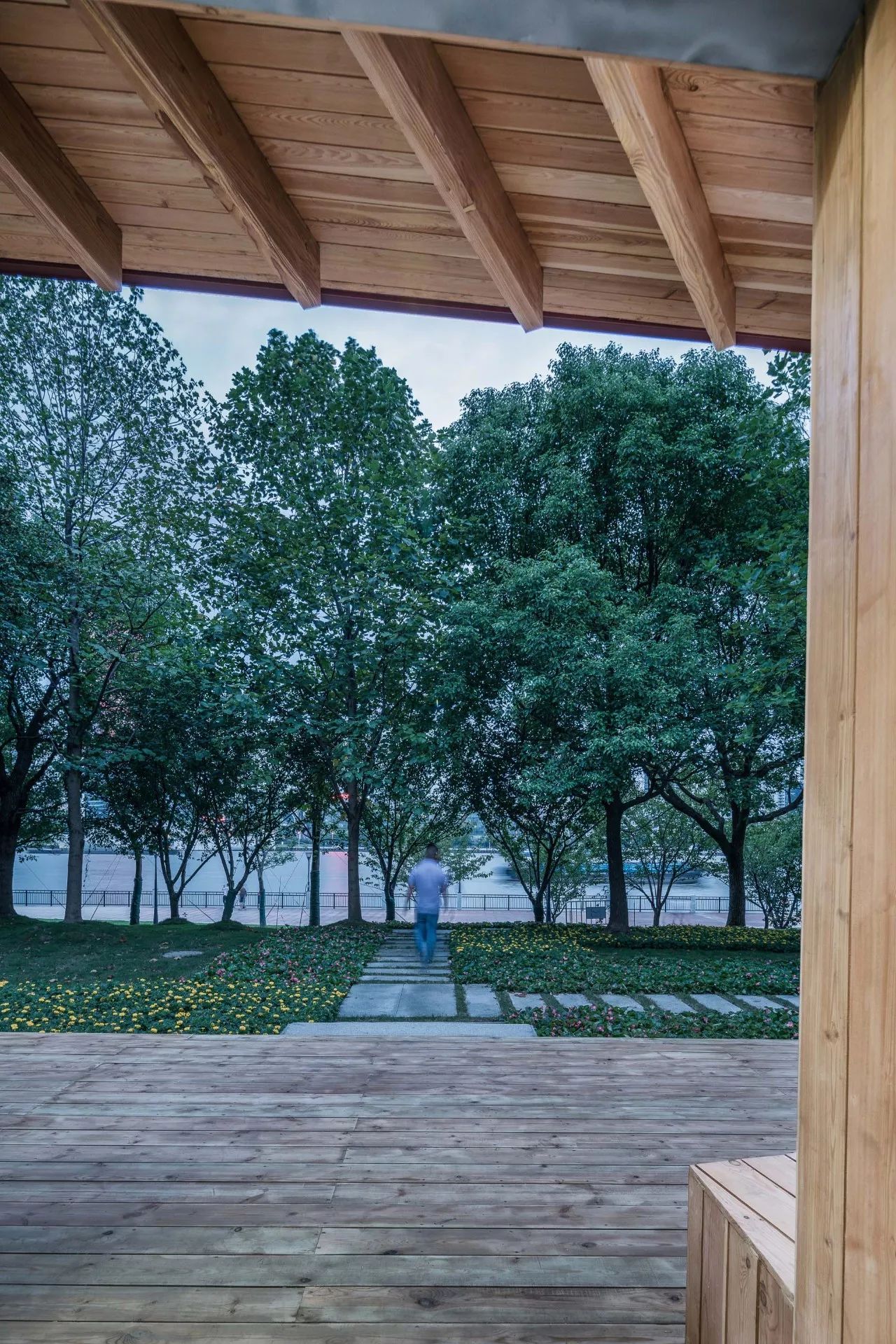 两侧身后廊下的长凳吸引人们安坐下来,悠闲地观赏江景。此时人们只能看见闪烁的江面,对岸的城市隐在树丛之后,有一种特别的宁静之感。当然,当人们走下平台,顺着树丛中的汀步蜿蜒下行,就是跑步道和亲水平台,在那里,浦江两岸的城市天际线一览无余。