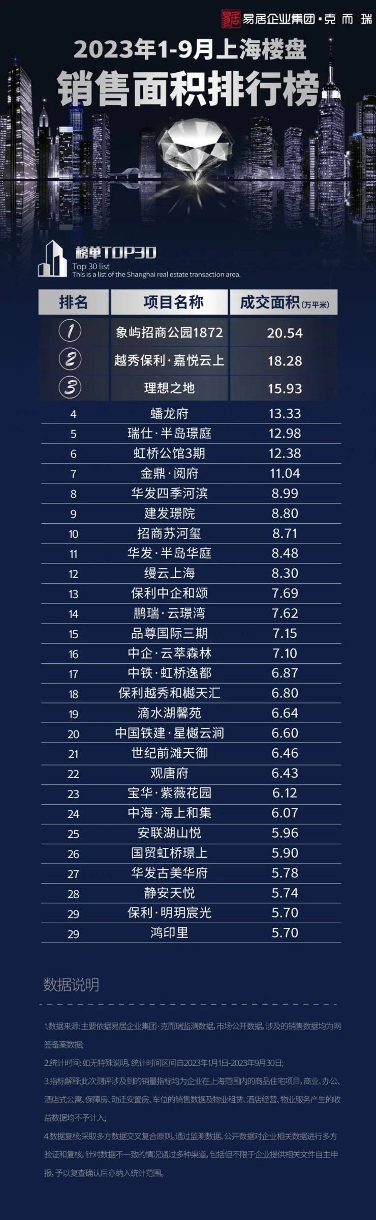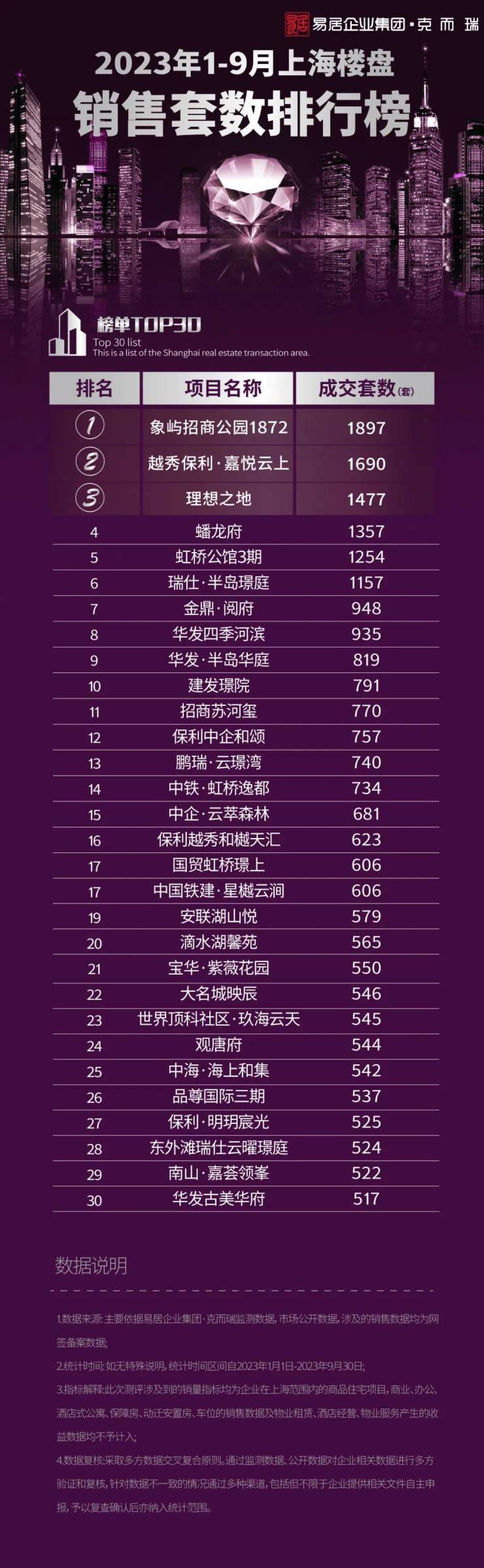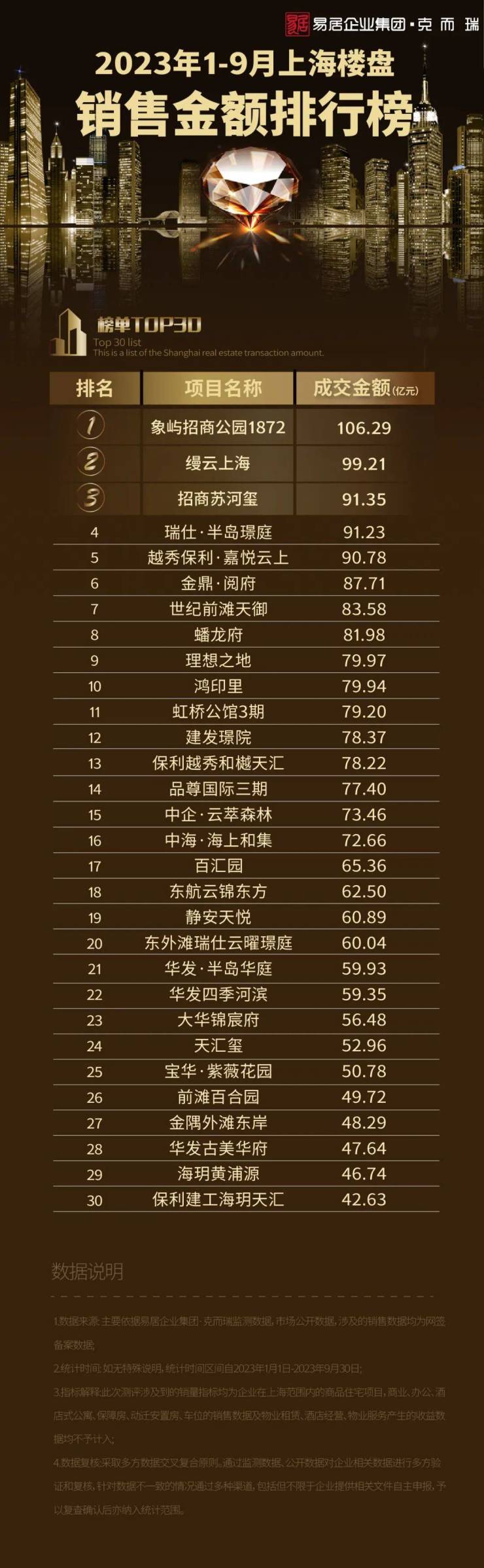 2023年1-9月上海楼盘销售排行TOP30 这个项目荣膺“三冠王”