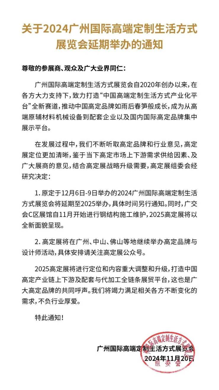 2024年11月20日,广州国际高端定制生活方式展览会组委会发布通知,原定于2024年12月6日至9日举办的展会将延期至2025年举行,具体时间将另行通知。据悉,延期的主要原因是为更好地适应高定市场上下游需求变化,提升展会战略定位和展示效果。同时,广州交易会展馆将于2024年11月起进行钢结构施工及维护,2025年展会将以全新面貌呈现。