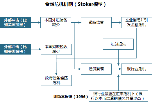 尽管中国劳动力比较优势逐渐丧失,人民币国际化增加外汇外流压力和区域结构性泡沫等问题存在,但在美国“减税+加息”的负面影响下,不具备爆发系统性金融风险的基础。但不可否认,美国的冲击将对外汇储备较少、银行本币债务和政府债务水平占比较高和出口导向型的经济体将产生直接影响,类似“次贷”危机式的全球经济金融危机蔓延对中国的冲击需要警惕。