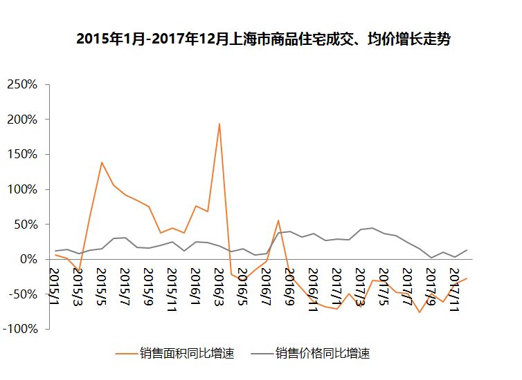 上海商品住宅市场在持续政策收紧的影响下,市场呈现“量缩价涨”态势,2017年,上海商品住宅面积共成交预计630万平米,同比大幅下降54.4%(项目供应集中在外郊环和郊环外),商品住宅成交均价为47809元/平米,同比增长27.85%(商品住宅成交中高端项目占比较高)。供应面积连续多月小于销售面积
