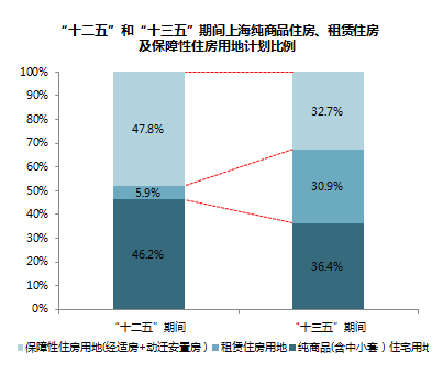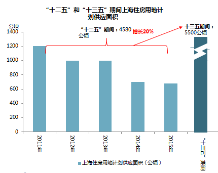 上海住房发展“十三五”规划指出,“十三五”期间住房用地供应量为5500公顷,较“十二五”期间增加20%,主要是稳定市场预期,消除市场对未来上海供地将会紧张的预期。但从住房供地结构来看,上海租赁住房用地比例大幅提升,通过租赁用房缓解房地产市场供求失衡,而纯商品住宅用地供应比例缩减。从特别量上看,纯商品住宅用地供应缩减约5.4%