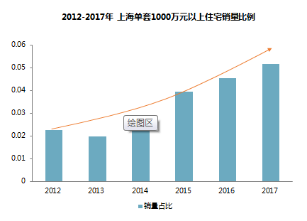 上海分区域住宅价格在过去六年大幅上升,单套1000万元以上住宅销量占比持续提升,产品“豪宅化”趋势明显。价格的提高将导致产品去化速度变慢