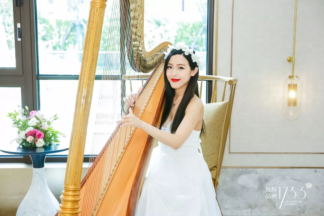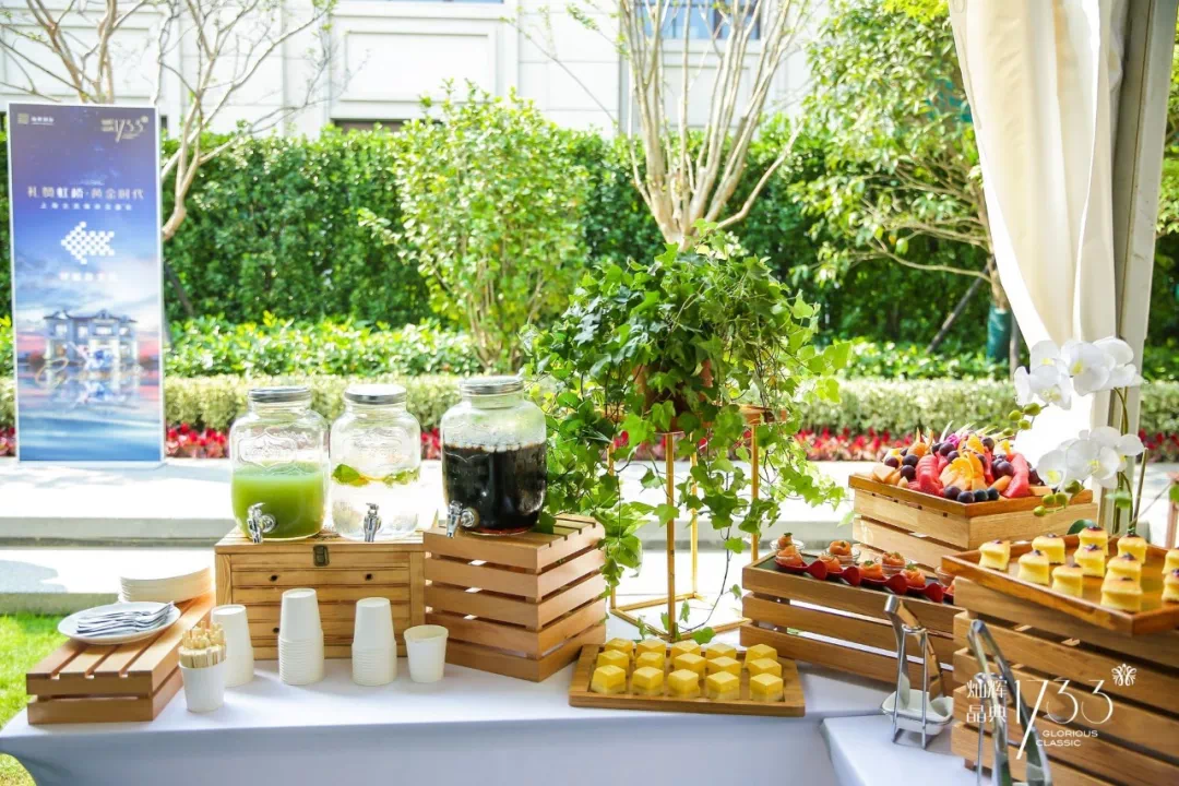 营销中心处,特别安排竖琴演奏礼遇各位来宾。浓荫的草坪广场处摆放了各式各样精美的美食、茶点,供来往宾客食用。