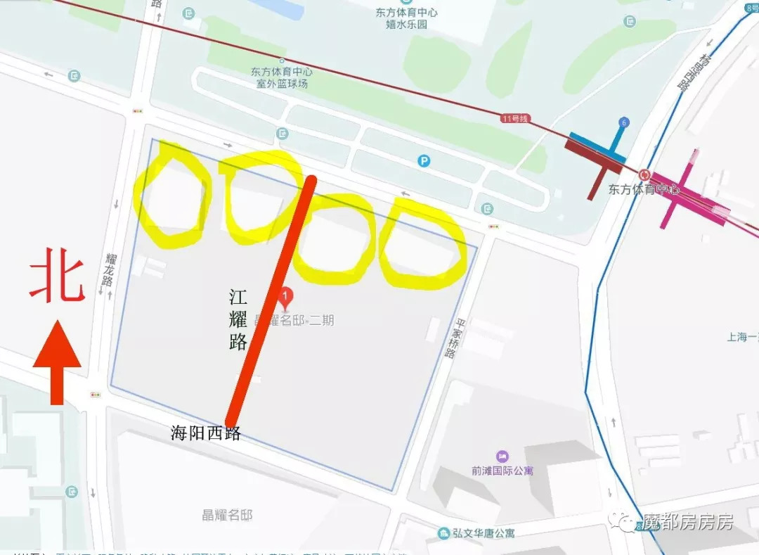 认筹规则公告中,晶耀二期所在的实际门牌位置“上海市浦东新区江耀路122弄”,相信大多数小伙伴跟我一样都在各种地图软件找不到!这是什么鬼?!不过还好有达人“前滩毛哥”指导,原来这是穿越了晶耀二期内部片区的一条路!如下图红色标记: