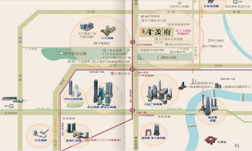 而且根据LIS土地投资顾问提供的网络素材显示,大宁金茂府附近三条高架环伺,距离南北高架汶水路匝道200米,距离中环汶水路匝道800米,距离内环中山北路3km,15分钟到达人民广场、新天地、陆家嘴、静安寺等大商圈,45分钟到达2大国际机场。