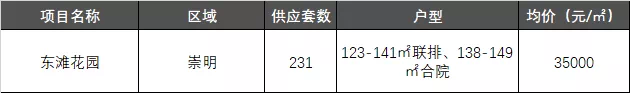 上周上海仅有1个新房项目入市,为位于崇明的东滩花园,项目推出123-141㎡联排、138-149㎡合院,共231套。