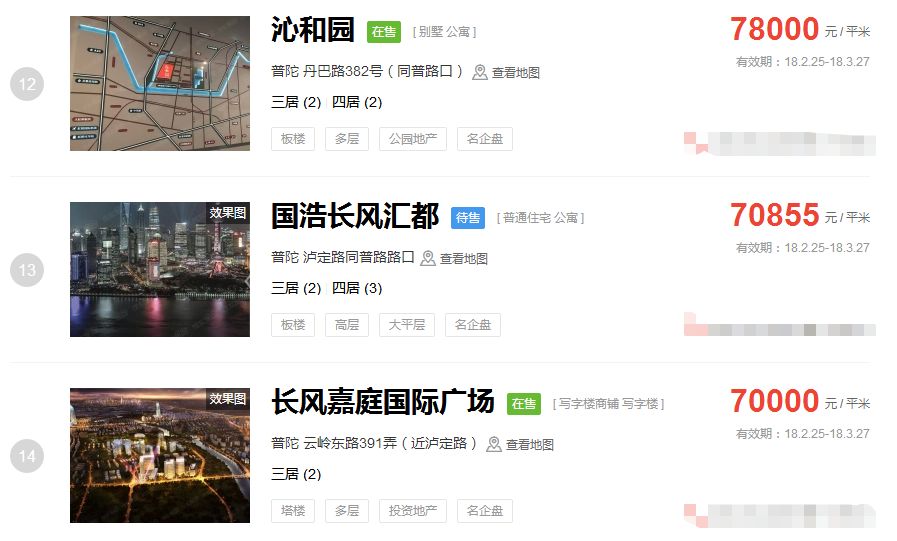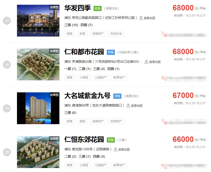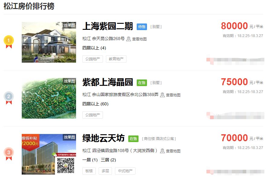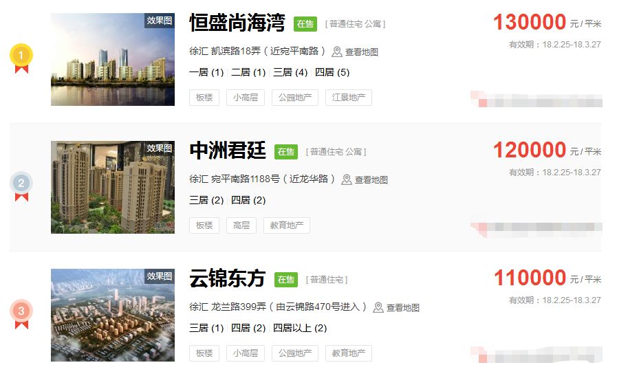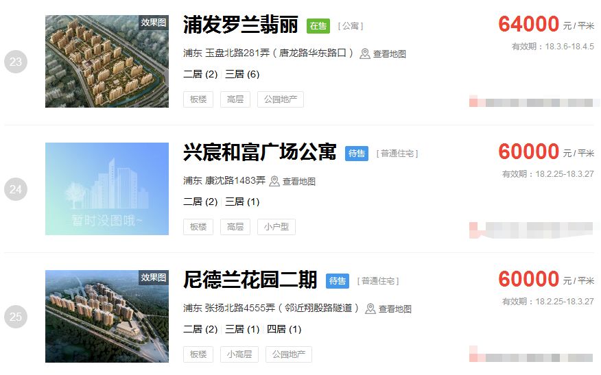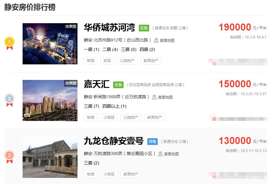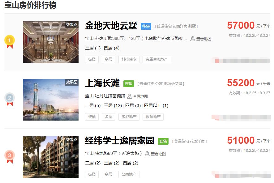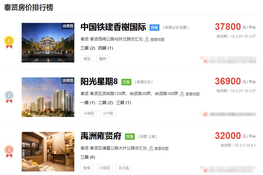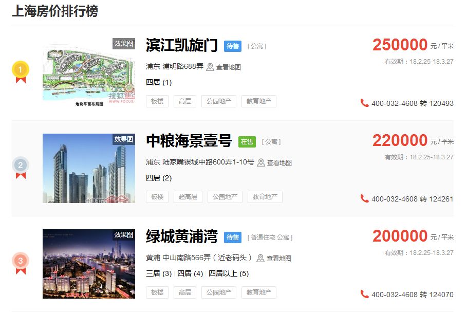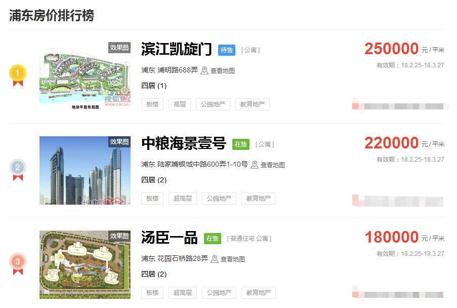占据上海新房房价排行榜前三的价格