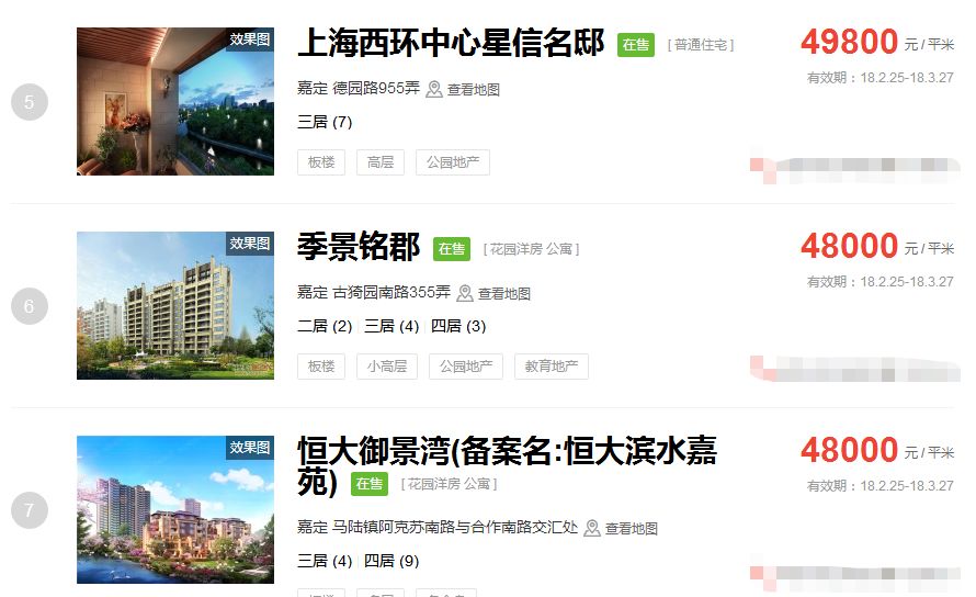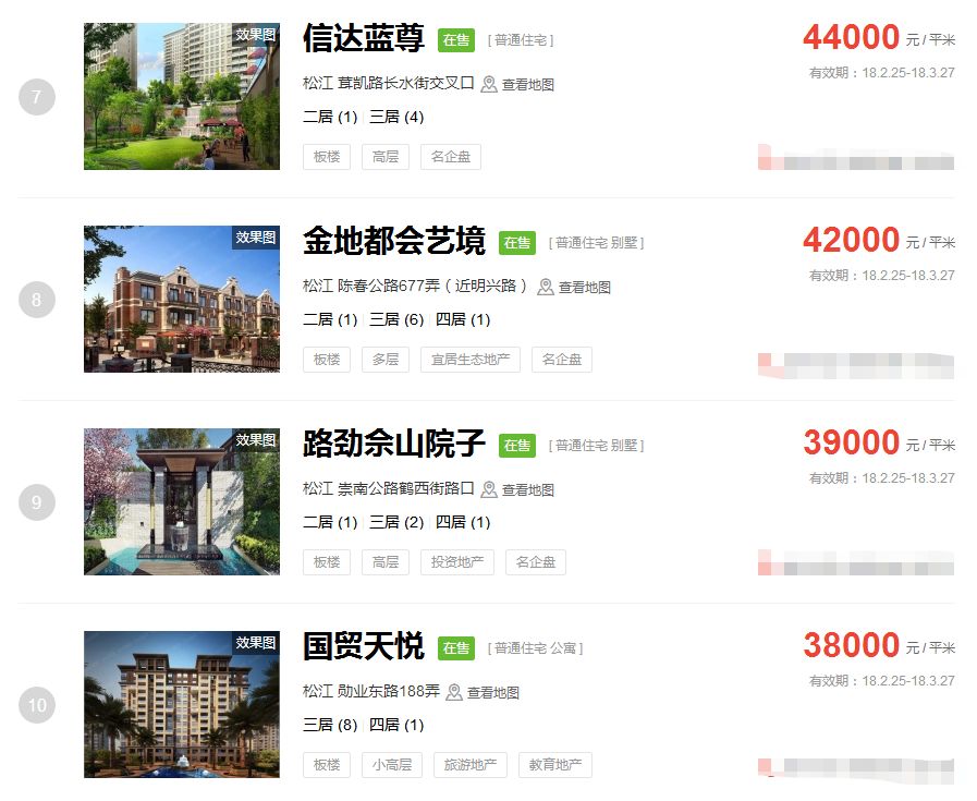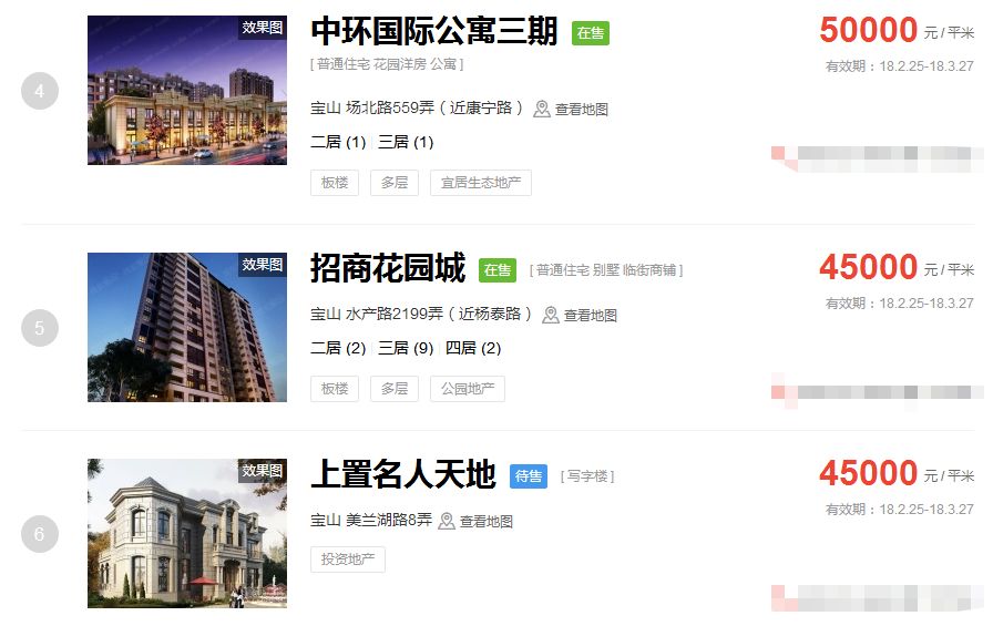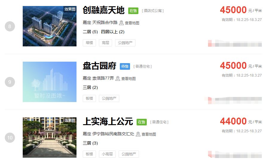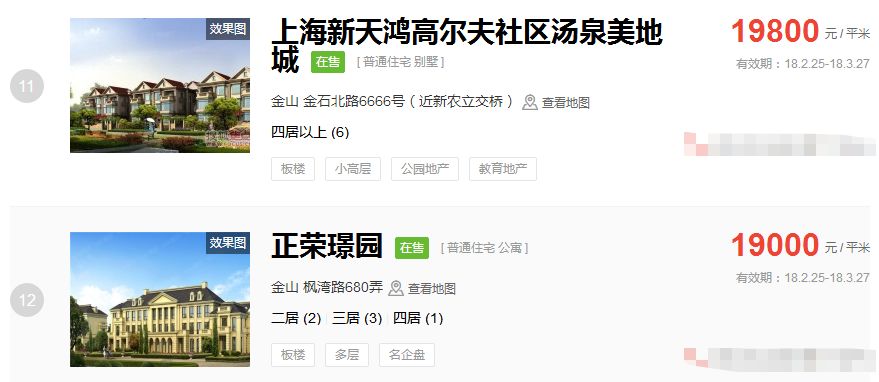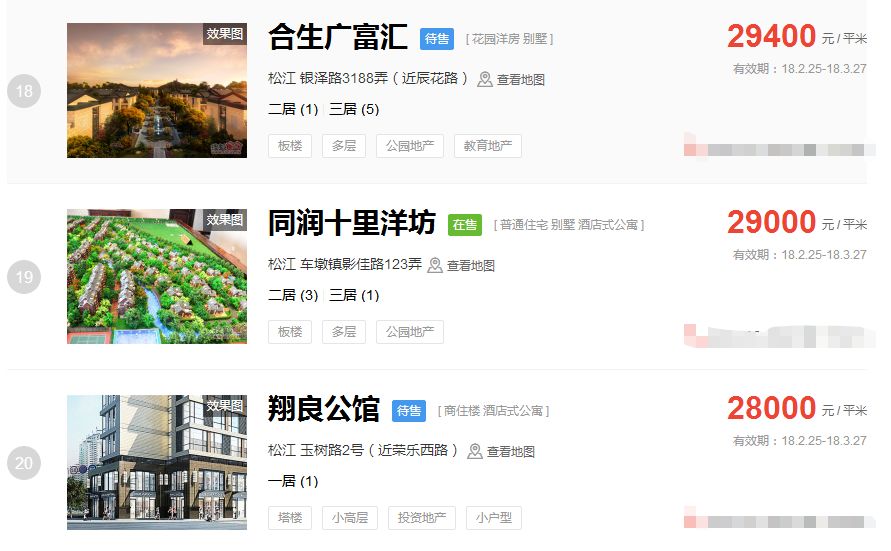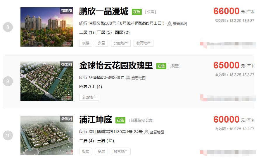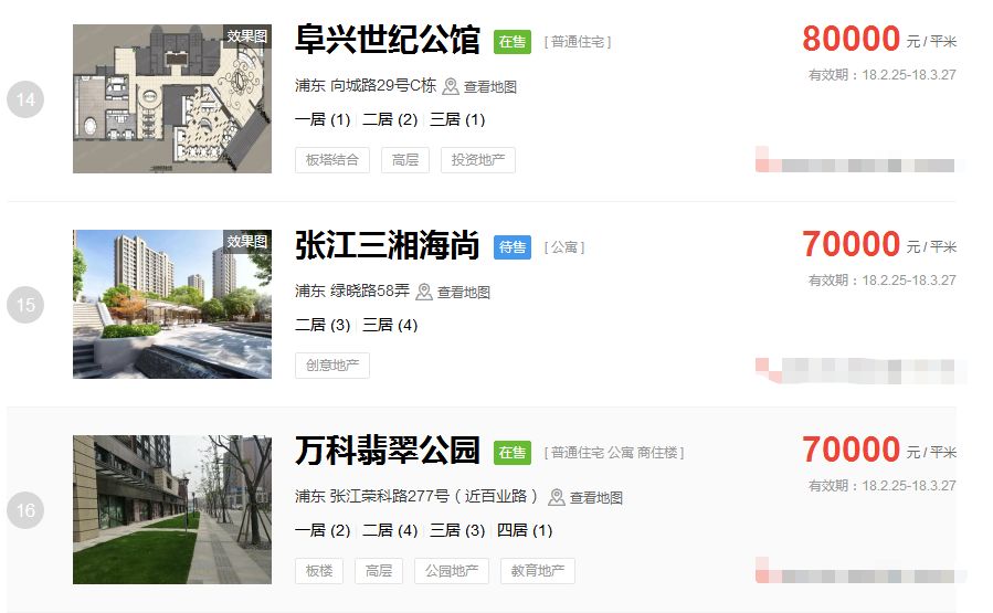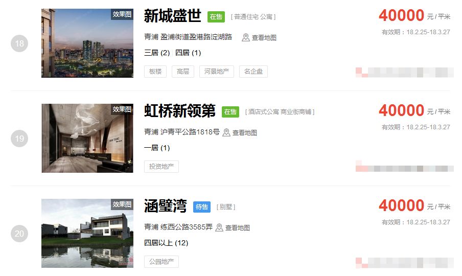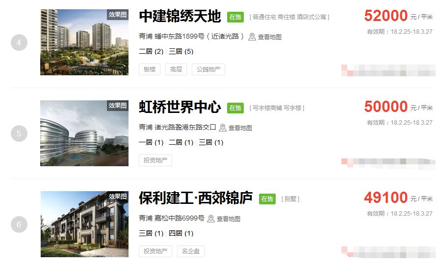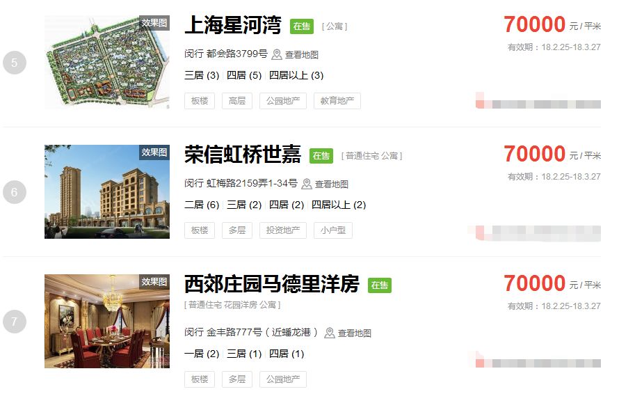 占据上海新房房价排行榜前三的价格