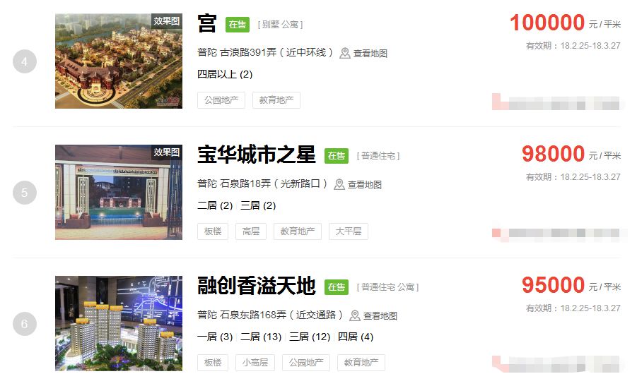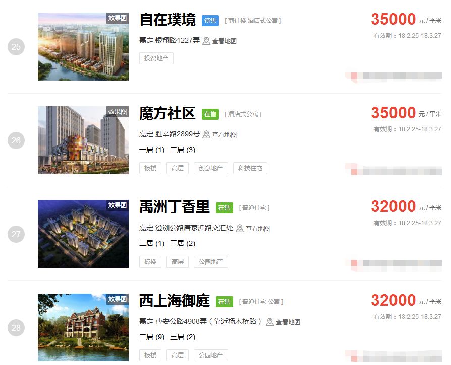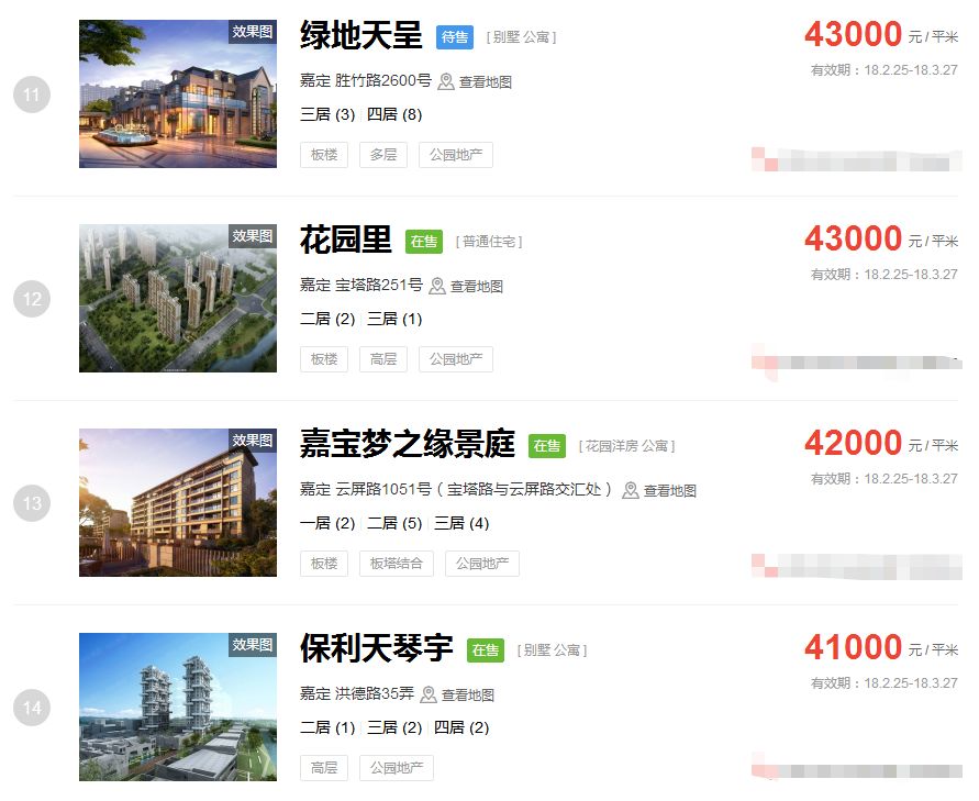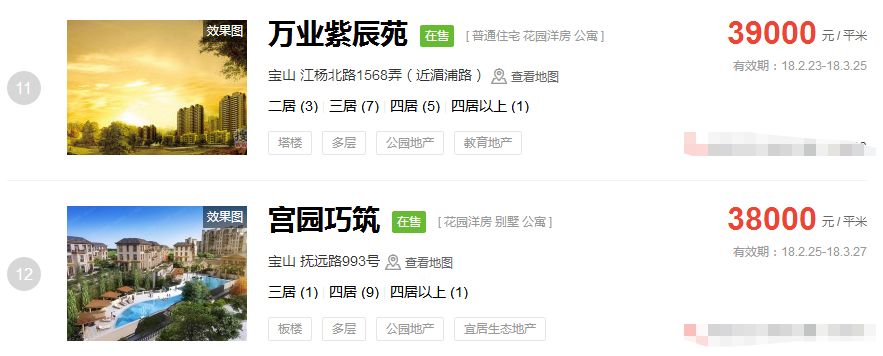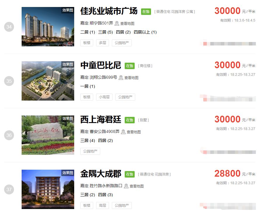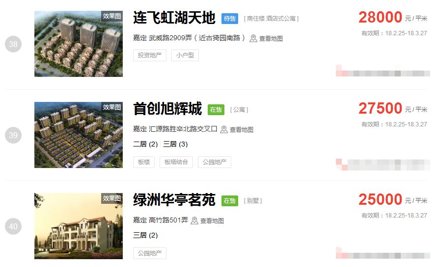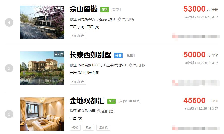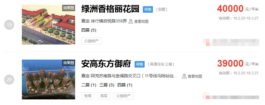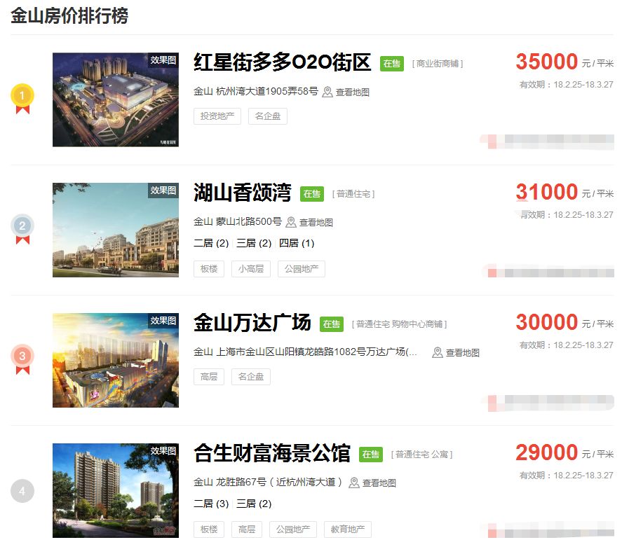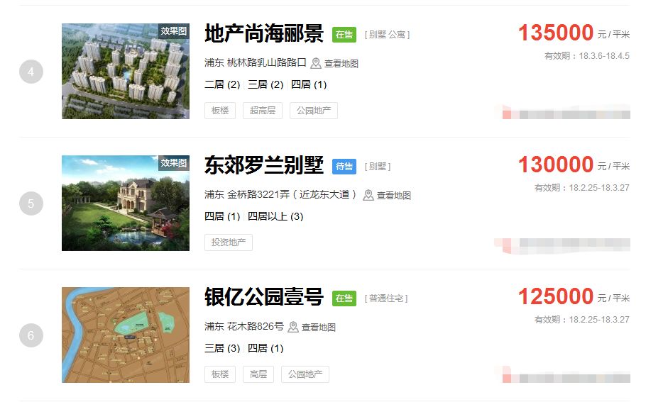 占据上海新房房价排行榜前三的价格