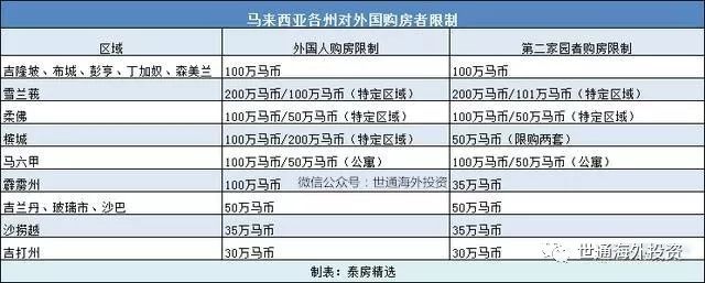 针对外国人购房政策上,政府要求外国购房者只能购买100万马币(约人民币165万元)以上的房产,但各州对此政策的底线要求不一,具体见下表。