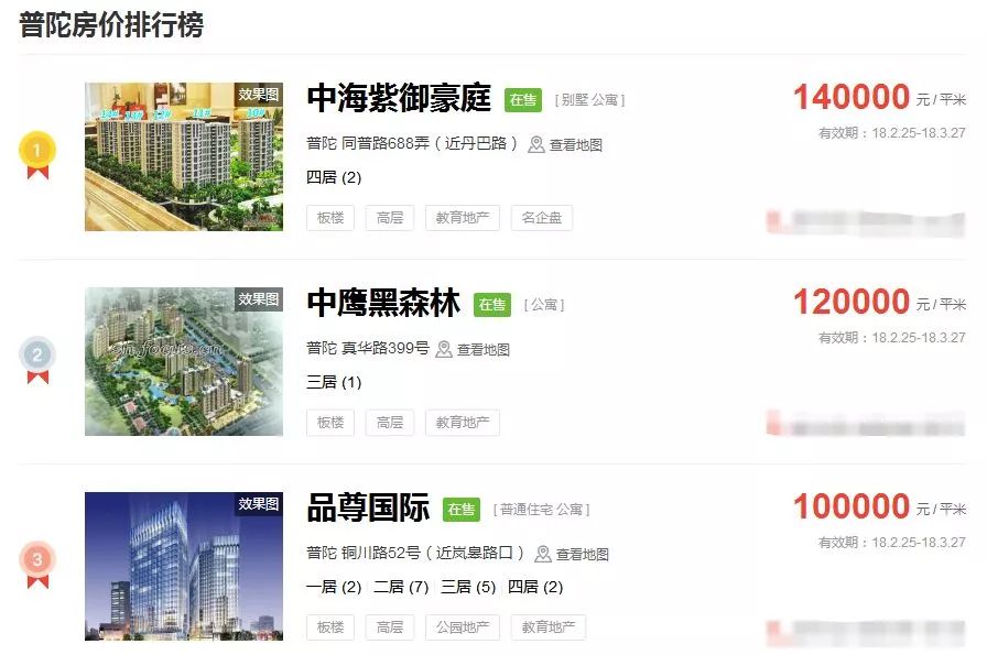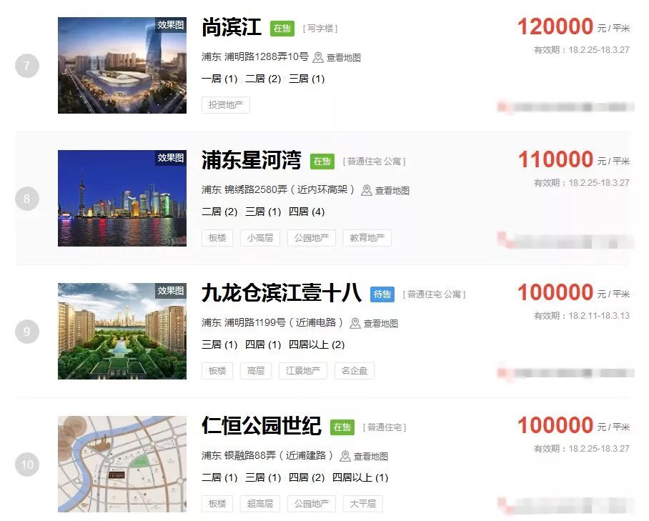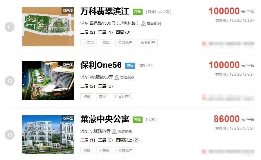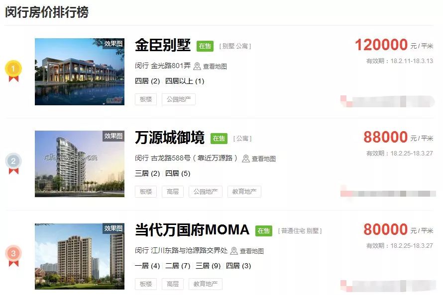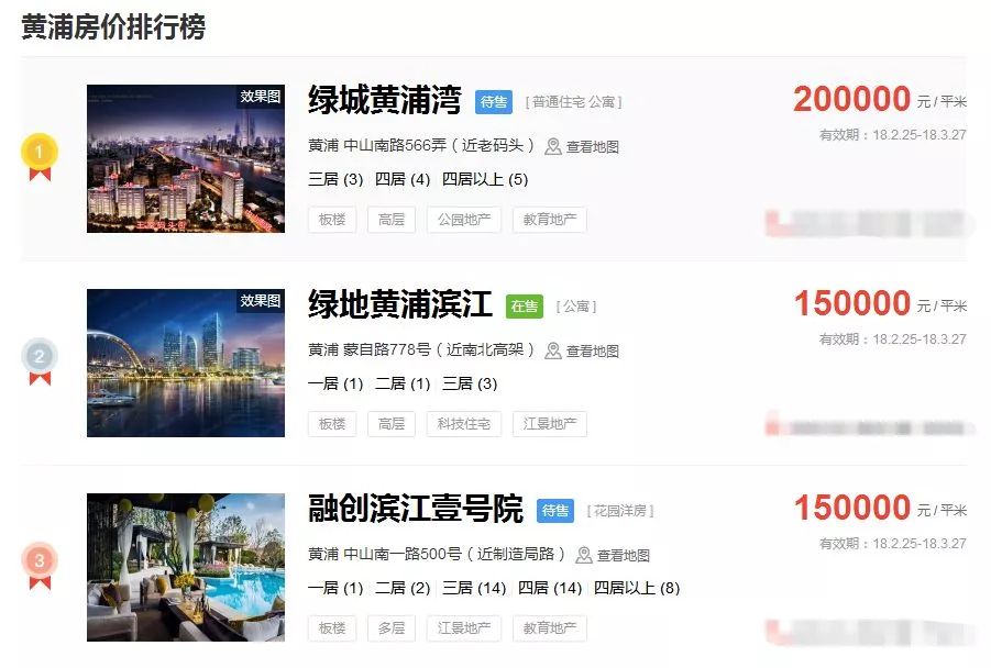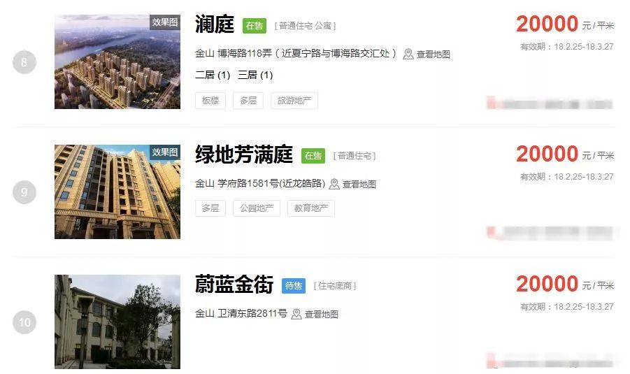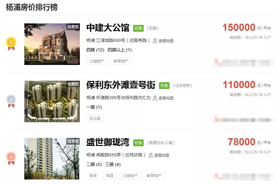 占据上海新房房价排行榜前三的价格