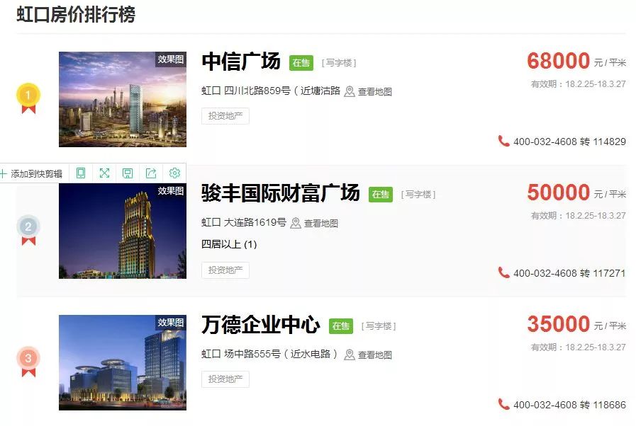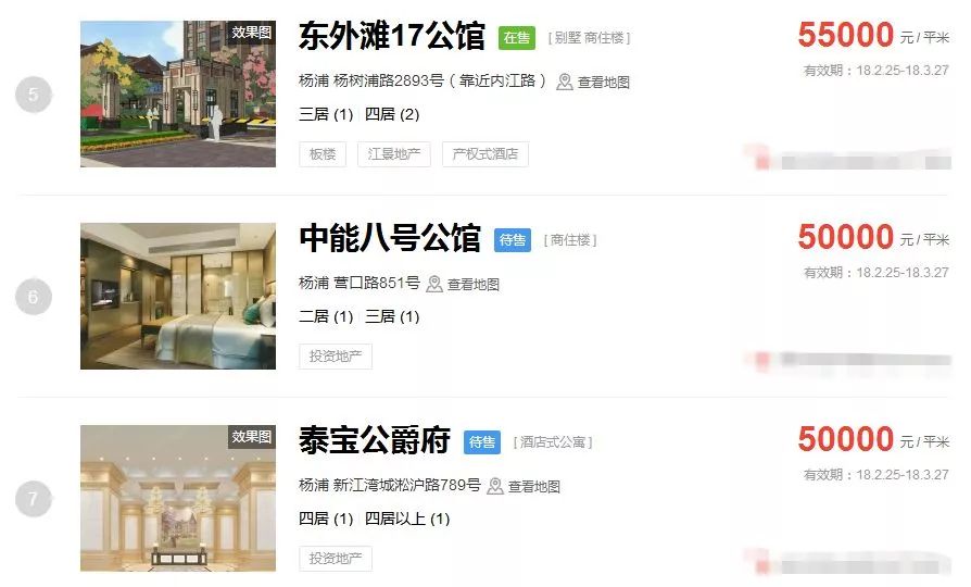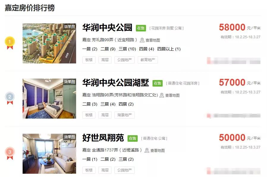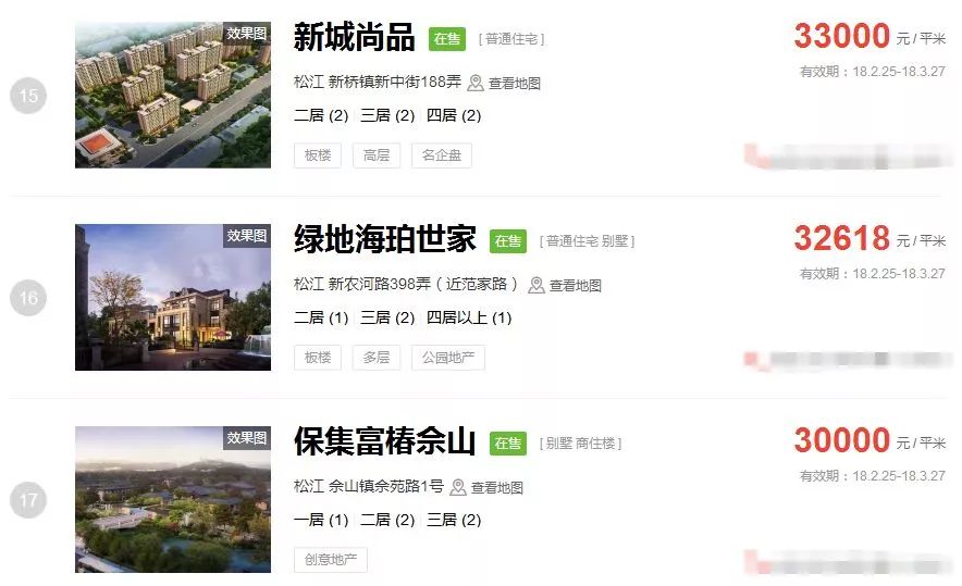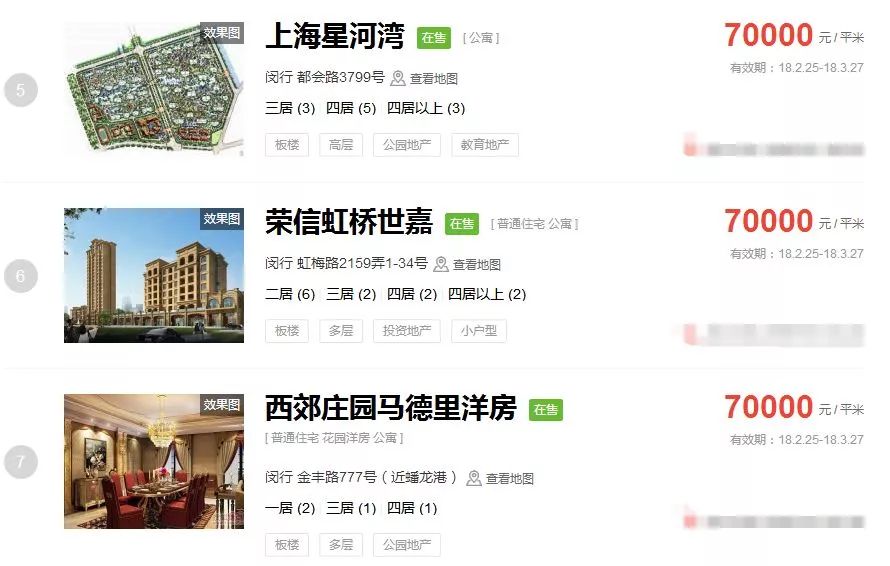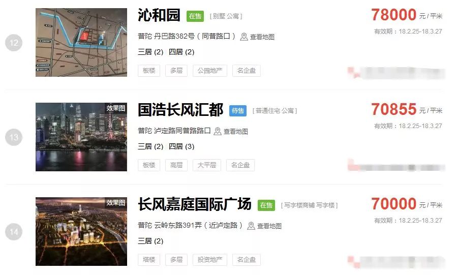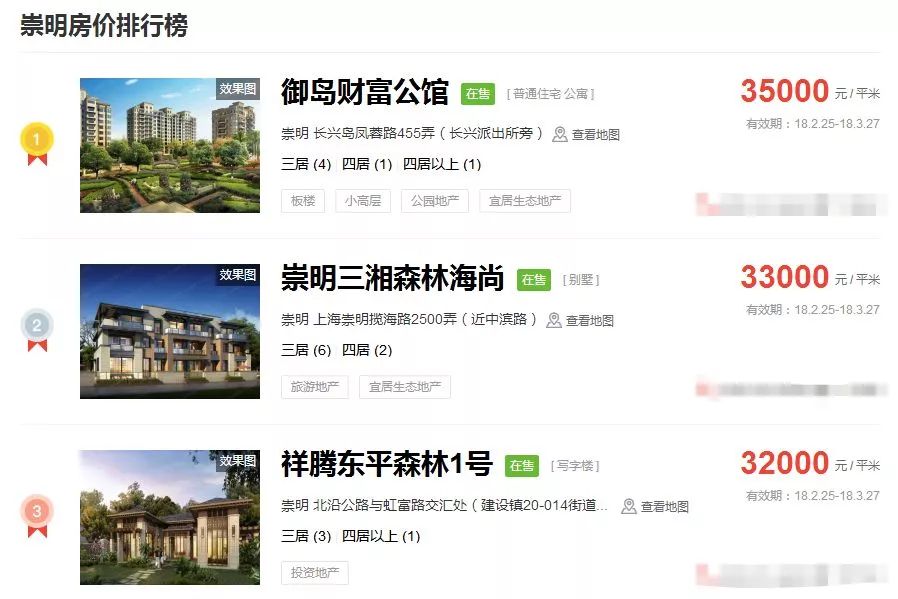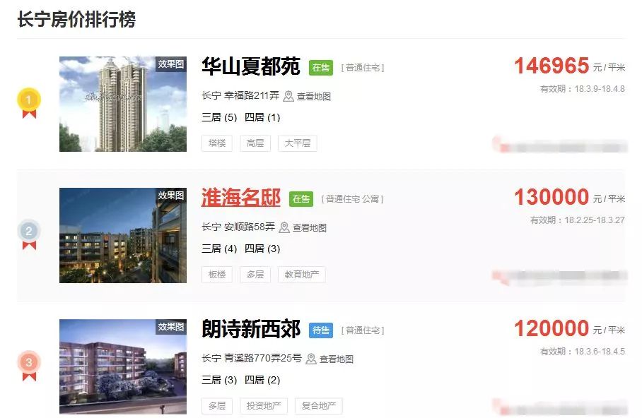 占据上海新房房价排行榜前三的价格