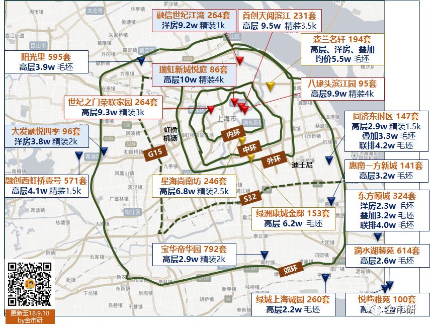 本周走势 2018年第36周(9.3-9.9)上海商品住宅供应3.1万方(因数据延迟,统计的供应主力为万科启辰),成交13.7万方(1133套),成交均价61836元/㎡ 本周拿证 截止当前,上海全市已取证待开盘楼盘已超过18个 接近一半的盘为郊环附近楼盘,按现在开盘走势预估,未来项目去化将遭遇瓶颈