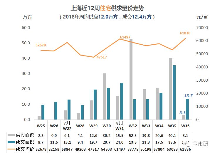 2018年第36周(9.3-9.9)上海商品住宅供应3.1万方(因数据延迟,统计的供应主力为万科启辰),成交13.7万方(1133套),成交均价61836元/㎡