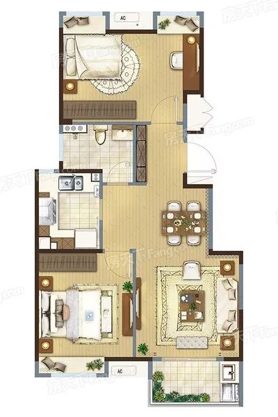 点评:正宗的正南正北、南北板式户型、各个空间户型方正,无浪费空间、室内方便家具布置;整个空间全明通透,采光良好,同时利于居住空间通风;南北卧室带飘窗,空间感更大、厨卫等各个功能区的面积大小都比较合理,居住体验便利,整体舒适度高。