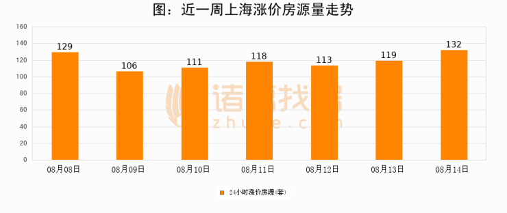 根据诸葛找房数据显示,上海24小时涨价房源量为132套,较08月13日增加13套,环比上涨10.9%。与此同时,涨价房源占比小幅扩大,业主信心有所提升。