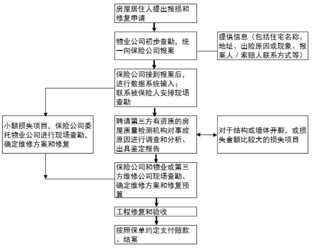 当业主提出报损和修复申请后,由物业公司进行初步查勘,确定原因和核实保险责任后,由物业公司统计后统一向保险公司报案,报案时应提供保险单号、住宅小区名称和地址、出险原因或现象、报案人/索赔人联系方式等信息。保险公司接到报案后,安排现场查勘,核实事故原因和保险责任。