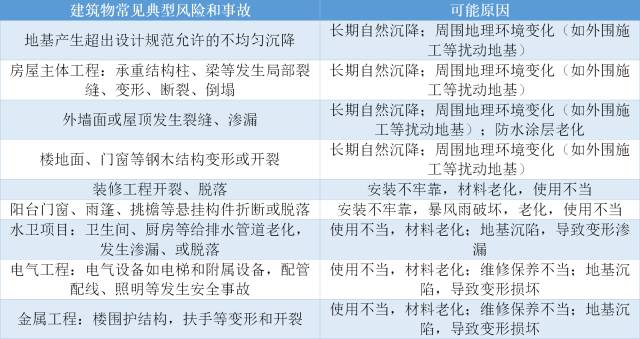 IDI的保险标的为建筑物,结合IDI的承保内容,我们罗列了建筑物的常见典型风险事故和可能的事故原因。从技术层面来看,事故原因既可能源于建筑物的潜在质量缺陷,也可能来自于外界情况改变造成的地质环境变化。鉴于IDI承保的是建筑物潜在质量缺陷所造成的损失,保单中对于“潜在缺陷”的定义,以及赔案处理过程中对于损失原因的调查,都是至关重要的。