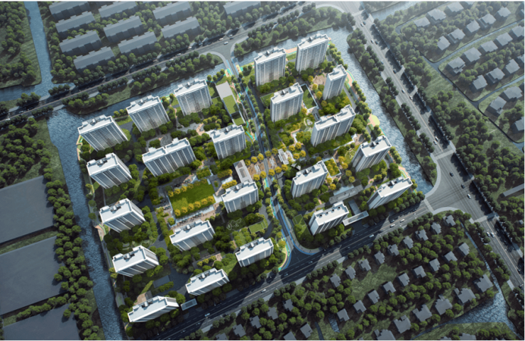 项目整体采用现代典雅的建筑风格,打造新海派滨水国际生活住区。建筑立面简洁又不失庄重典雅。景观方面,项目三面环水,营造公园式景观和滨水湾居生活场景,匹配多元生活需求。