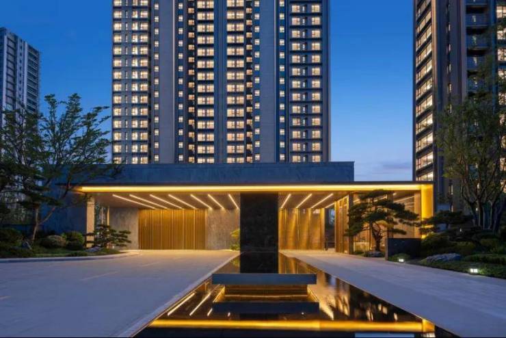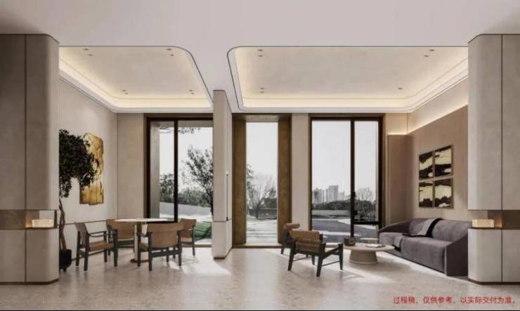第一重酒店式门庭,约32米宽6.5米高的入户门头,采用蓝翡翠奢石、名贵松树等,营造酒店落客的微度假氛围;门头进来,是约3000平米的大草坪和水景,种植名贵树种,尊崇感拉满。