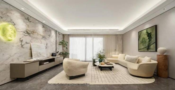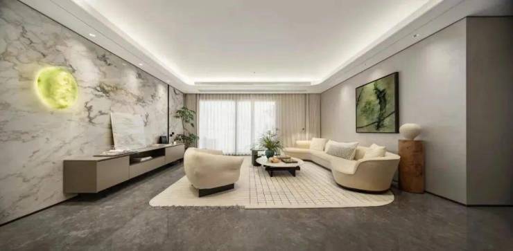 推开门,入户玄关采用意大利卡拉卡塔金天然大理石,石材中金色线条与碧翠纹理交织,这样的品质也用在了大客厅背景墙。