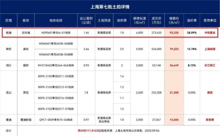 就以最近的土拍资讯为例,2025年9月,上海第七批次集中供地中,杨浦滨江N090601单元14-01地块(杨浦大桥旁的内环宅地)吸引了9家央国企激烈竞拍,最终以27.36亿元竞得,溢价率高达28.09%,楼面价达9.25万元/㎡,再次刷新杨浦区纪录,市场预期该区域未来售价或超15万元/㎡。