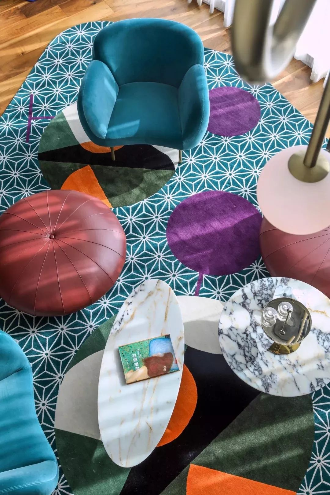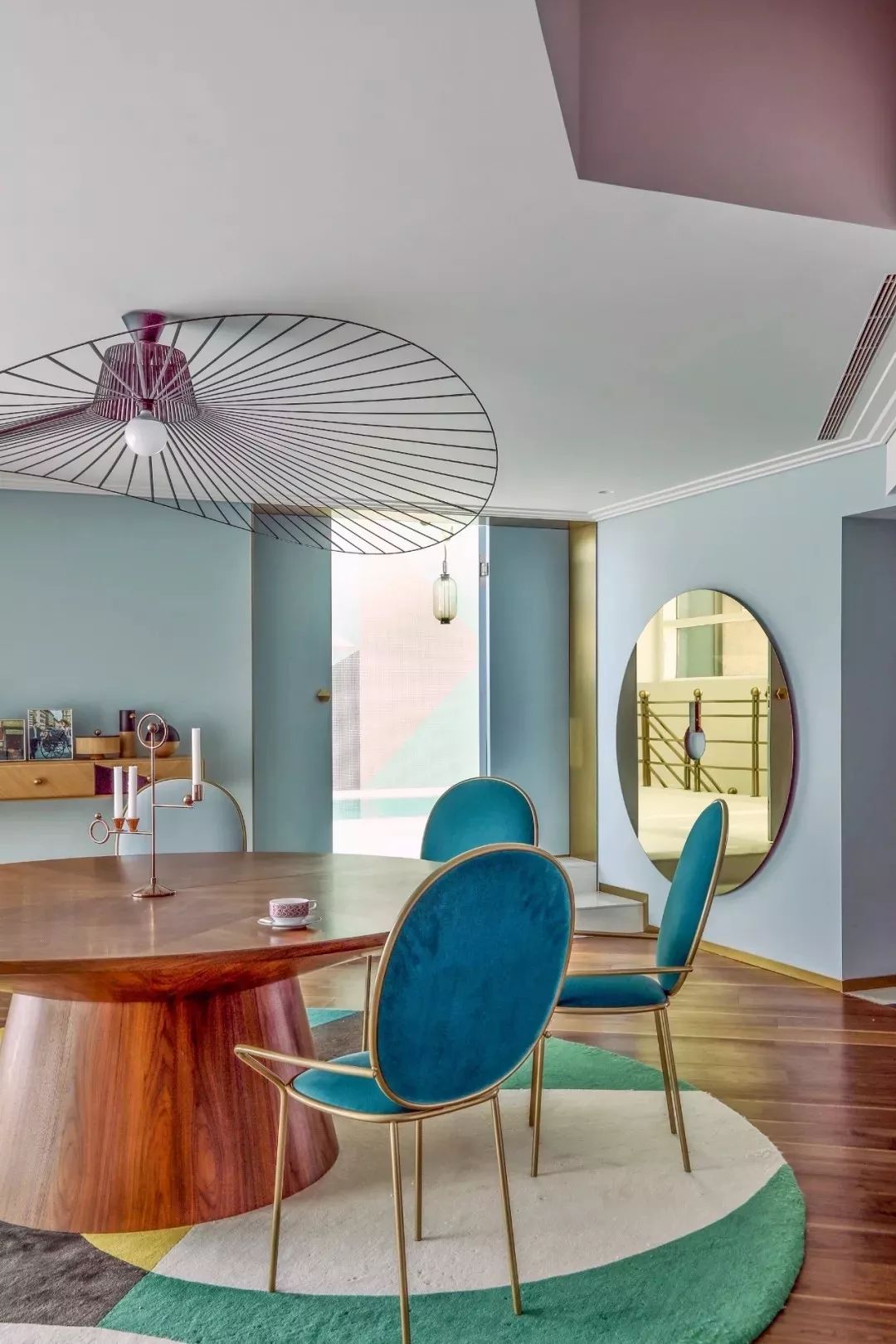 颜色是整个房子的设计亮点。家具大部分是深颜色的,比如地毯、凳子、墙纸。但其他空间以柔软的颜色为主,比如浅蓝色、灰色、浅粉色、浅绿色,营造一种优雅感。