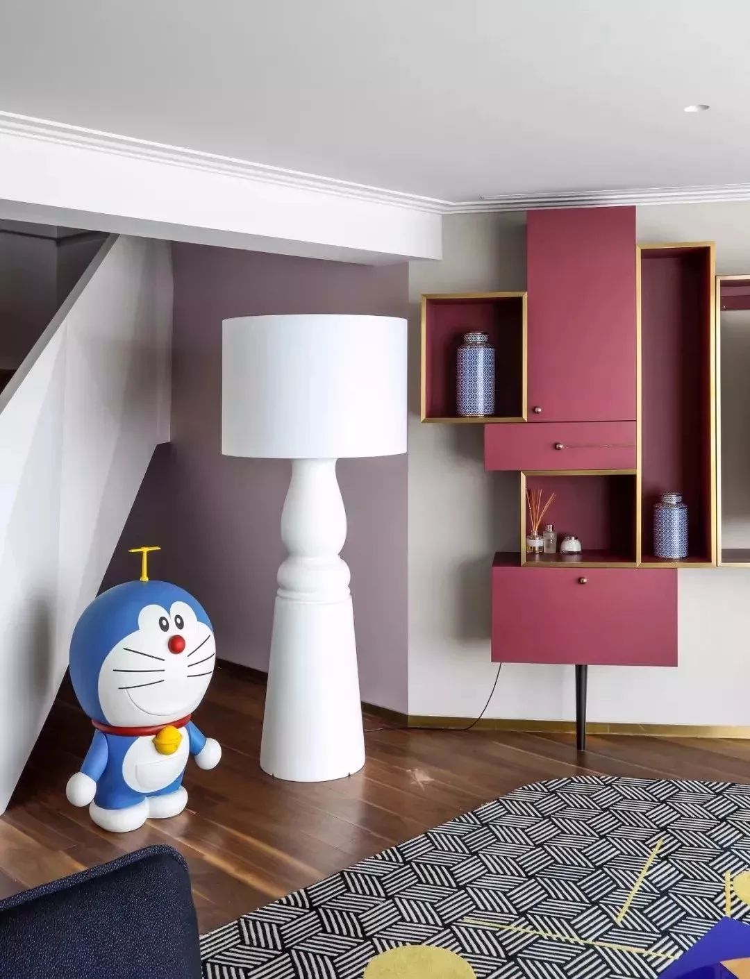 我们家每一个空间都有自己的主色调,客厅是原木色搭配多彩的家具,餐厅是黑白的,更衣室是粉色,书房是蓝色。结合客厅属性选择对应的主色调。