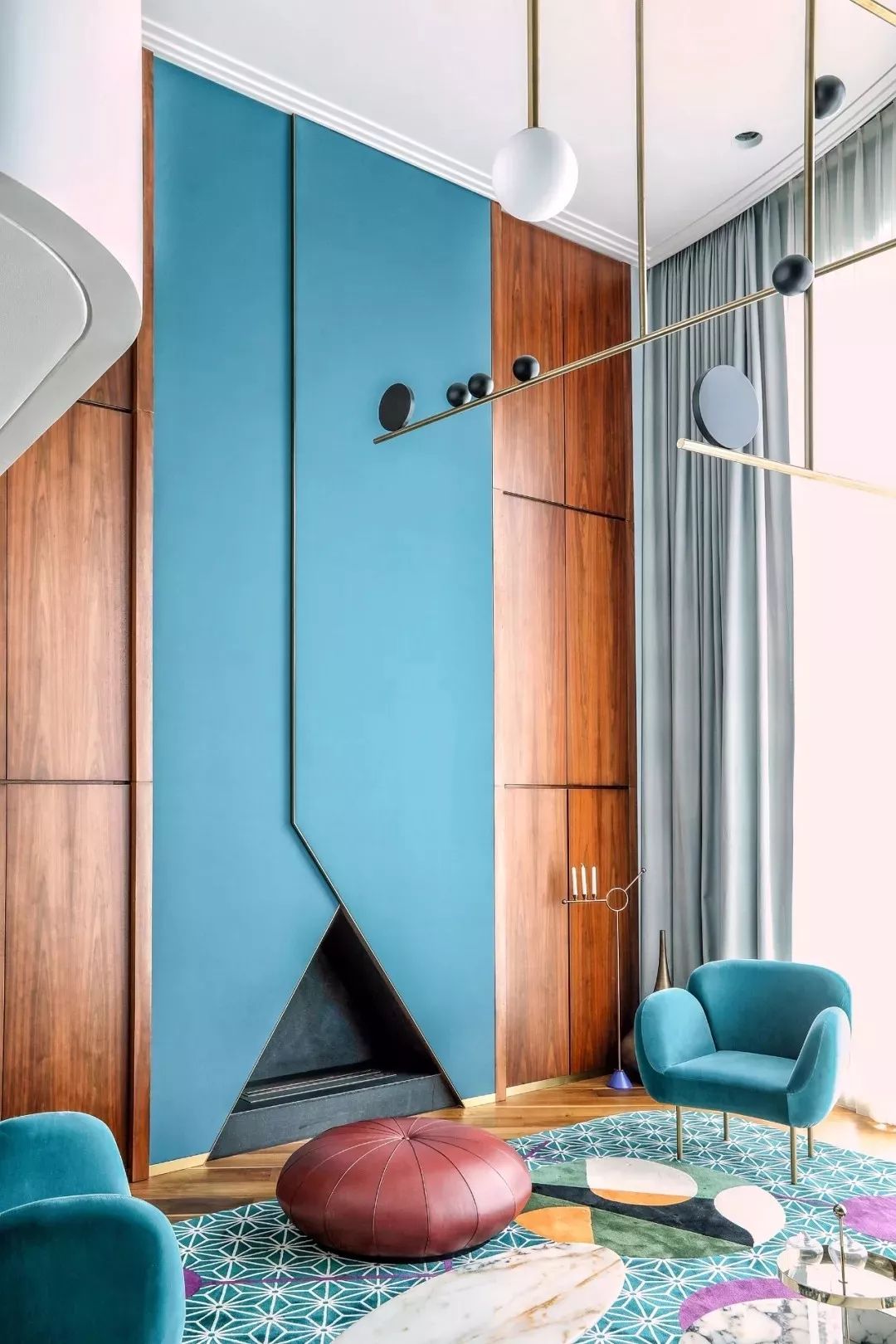 比如客厅的两扇巨大的自动旋转门,这扇门不仅将冰冷巨大的客厅分成两个区域,还创造出一个私密空间、给屋主更多空间上的可能性。旁边是很有中式传统风格的墙,对面安置了意式风格的现代壁炉。