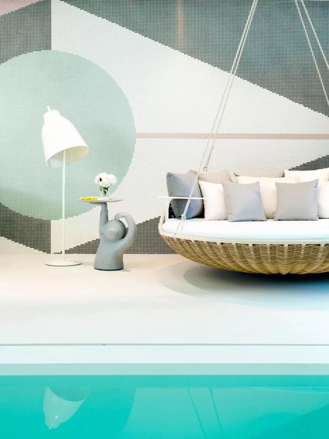 设计上也希望带来惊叹的效果。泳池旁边用了淡绿色、淡粉色的马赛克瓷砖作为装饰;石头元素可以给人带来宁静和优雅的感觉。