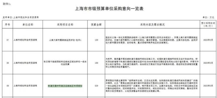 从上海市规划和自然资源局获悉,《轨道交通中环线及沿线地区专项规划》进入上海市级预算单位采购意向一览表,预计采购时间2025年3月。