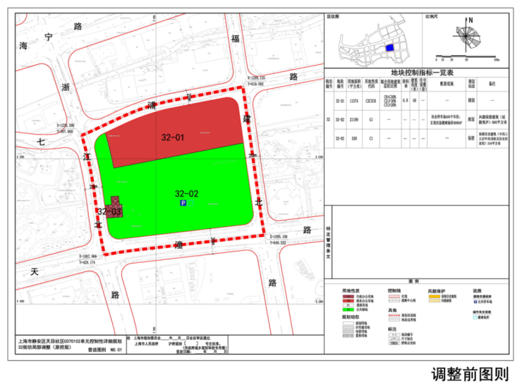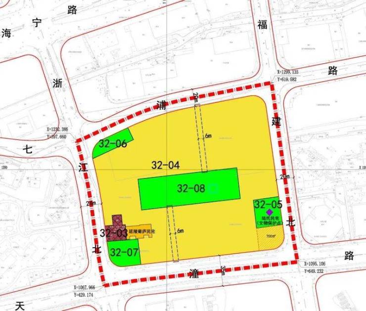 天目社区C070102单元32街坊,原规划50米高的商办,社会停车场,含风貌保留建筑和保留历史建筑。