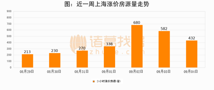 根据诸葛找房数据显示,上海24小时涨价房源量为432套,较09月03日减少150套,环比下降25.8%。与此同时,涨价房源占比小幅回落,对于购房者来说是一个入市窗口期,购房者可抓住时机入市。