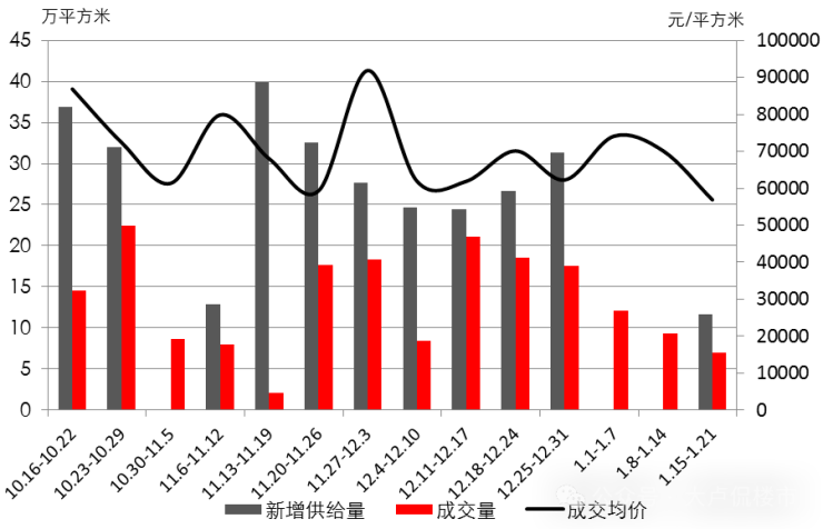 临近岁末淡季效应越发显著,产品投放节奏并不快,今年第一集中供应楼盘中还有10余个没有认筹。当然,相对寡淡的市场中还有些许亮点,苏河玺项目入围分数超过90分,说明市场好坏不影响网红项目的销售。但这些结构性产品又无法支撑起整体市场成交,供应疲软加之交易意愿涣散,后续成交大概率继续在低空运行,即便有波动,仅仅是交易量的反抽。