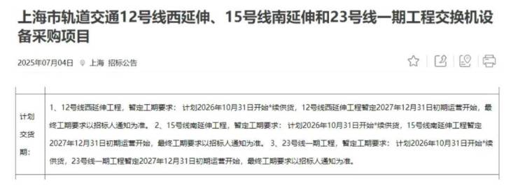 今年7月,上海申通发布《上海市轨道交通12号线西延伸、15号线南延伸和23号线一期工程交换机设备采购项目》,内容明确提到三条轨交线的计划通车时间: