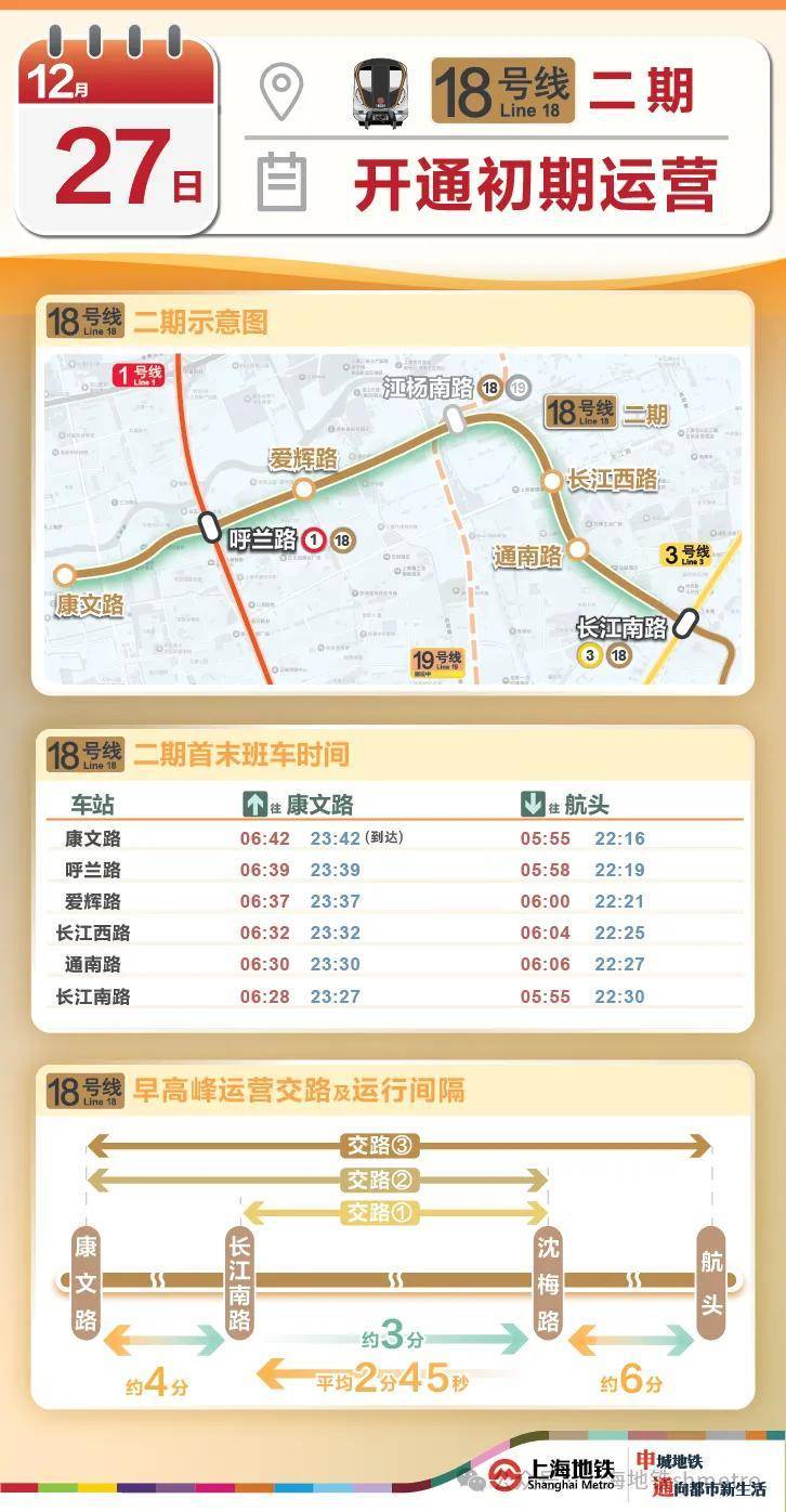 据上海地铁官方消息,12月27日(周六)首班车起,18号线二期工程将开通初期运营。该线路东起于一期工程长江南路站,西止于康文路站。本次投入初期运营的车站按自东向西,依次为通南路站、长江西路站、爱辉路站、呼兰路站和康文路站,共计5座地下车站。