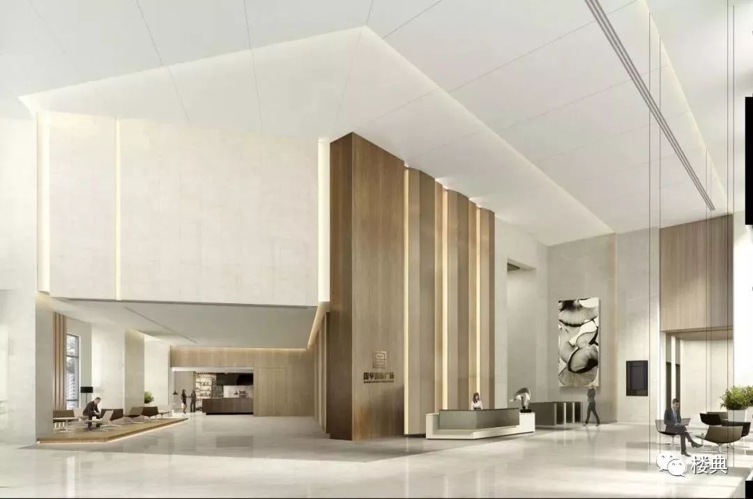 在室内空间设计上,国华中心也同样先进,摒弃传统甲级写字楼压抑的办公环境,从人文关怀的实际需求出发,为商务办公人群带来温馨、舒适以及少有的快乐办公体验。写字楼室内设计为业内知名的一工建筑设计咨询上海有限公司,在设计理念上通过简约、历练、不失亲和的建筑语言切入,融入商业综合体的属性,在一楼大堂呈现出”温馨、舒适、专业“的办公空间体验。主景观墙以几何斜面造型,配合木色饰面,形成丰富的层次和韵律,配合现代灯光,渲染出温暖、亲和的空间色调。功能上巧妙的利用空间错层,即全高商务区及半高休闲区,通过大与小、高与低的对话和呼应,配合天花和地面的极简设计语言,在办公大堂营造出别致的视觉效果。标准层设计同样延续的温馨、舒适、专业的办公空间体验。