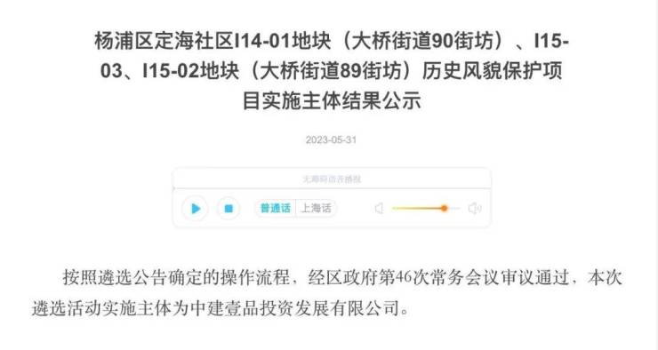 5月31日,据上海杨浦政府网站发布公告,杨浦区定海社区I14-01地块 (大街道90街坊)、I15-03、I15-02地块 (大桥街道89街坊) 历史风貌保护项目实施主体结果公示。