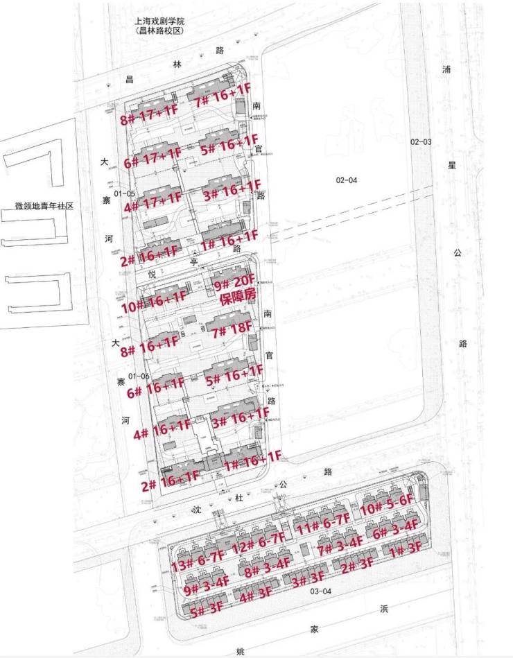 01-03地块:容积率2.4,拟建9栋17-18F高层住宅、1栋20F保障房以及若干社区配套用房,多数楼栋底层架空。